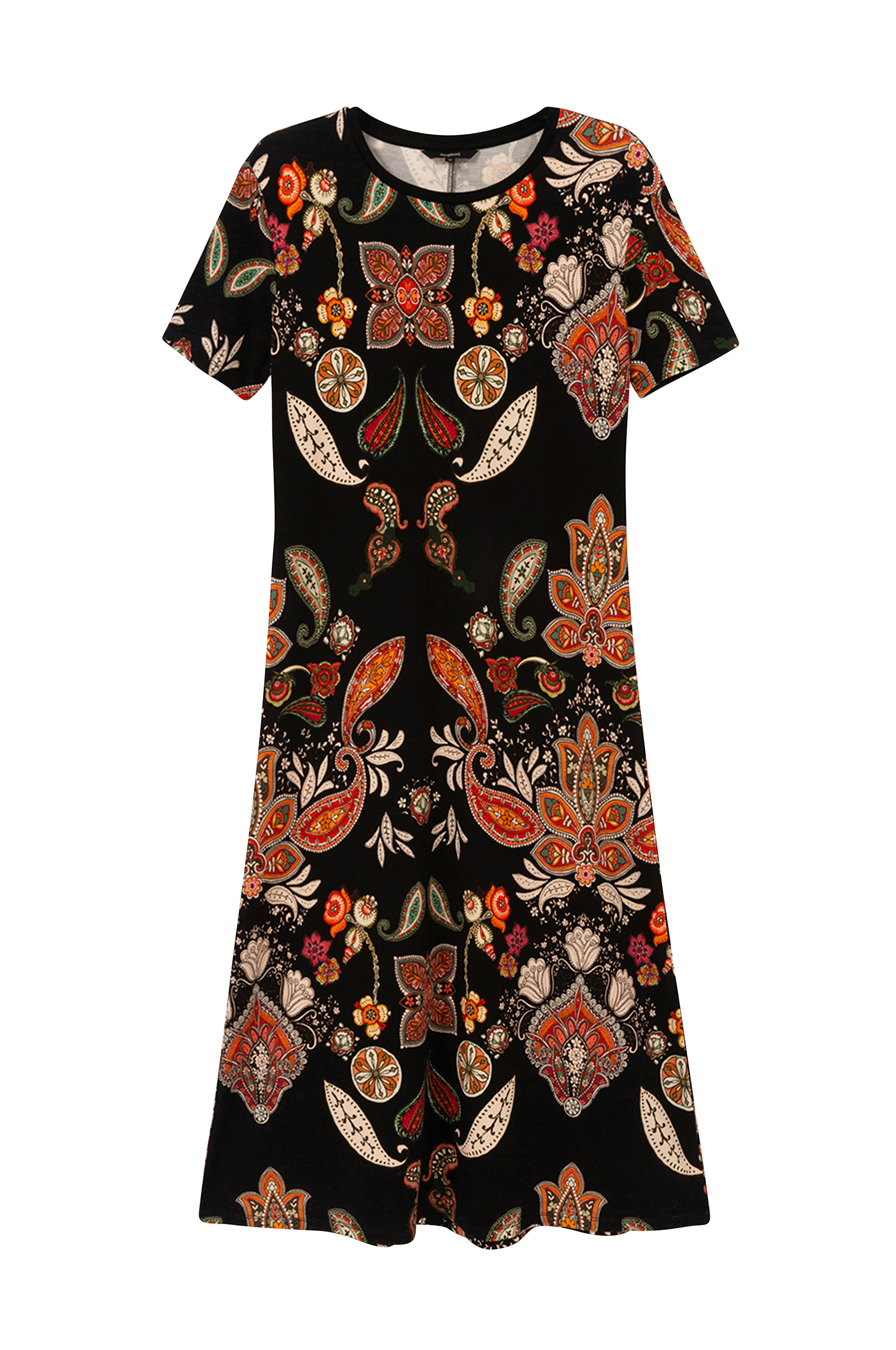 Klänning Vest Misuri från Desigual. Lätt figurformad modell med kort ärm och rund hals med liten ribbkant. Stretchtrikå med tryckt mönster runt om. Längd ca 115 cm i stl S.