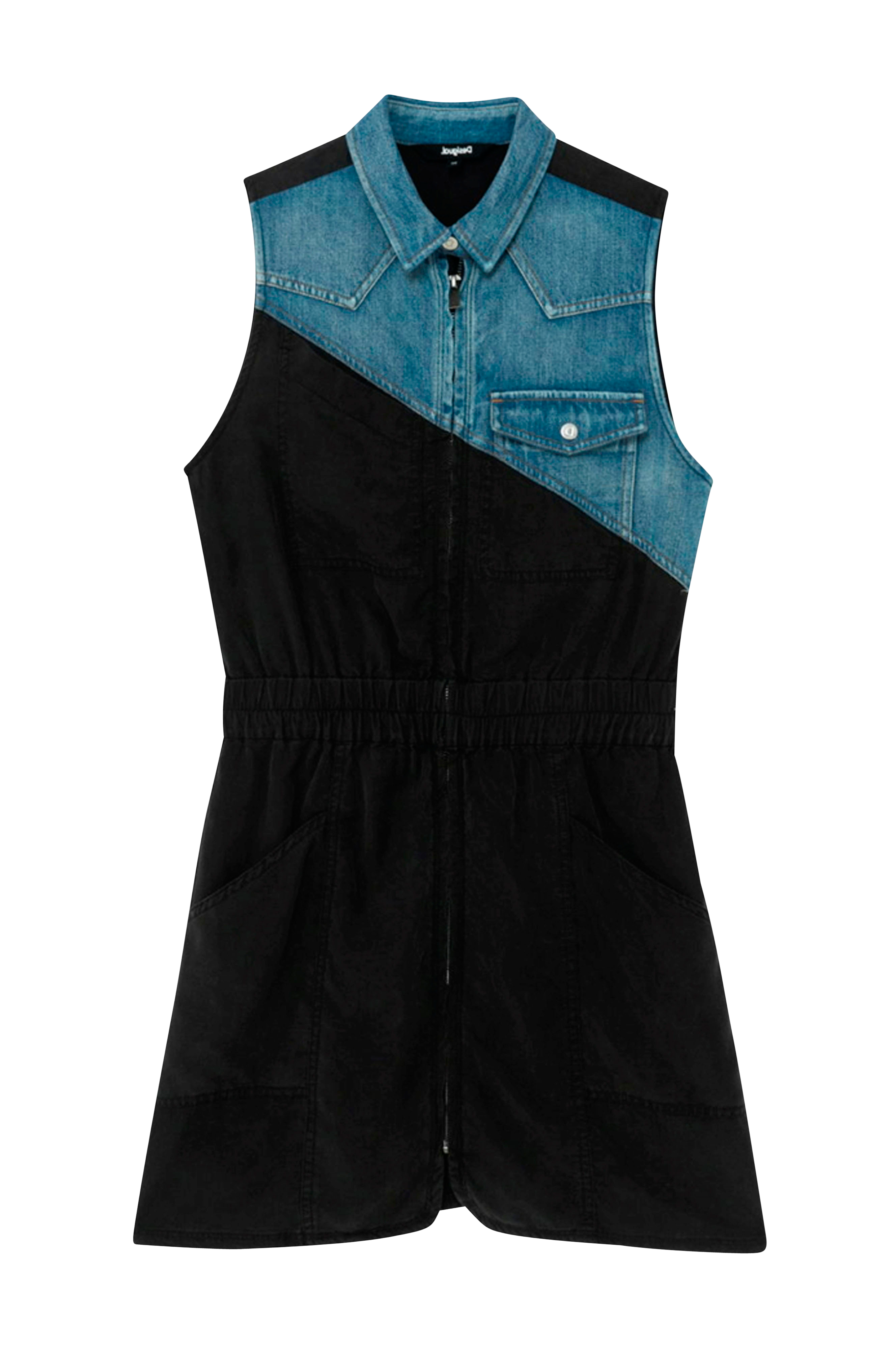 Figurformad modell utan ärm med diagonalt skuret ok i denim fram. Knäppning med dragkedja hela vägen fram och bred, infälld resår i midjan. Två stora framfickor och två bröstfickor. Längd ca 86 cm i stl S.