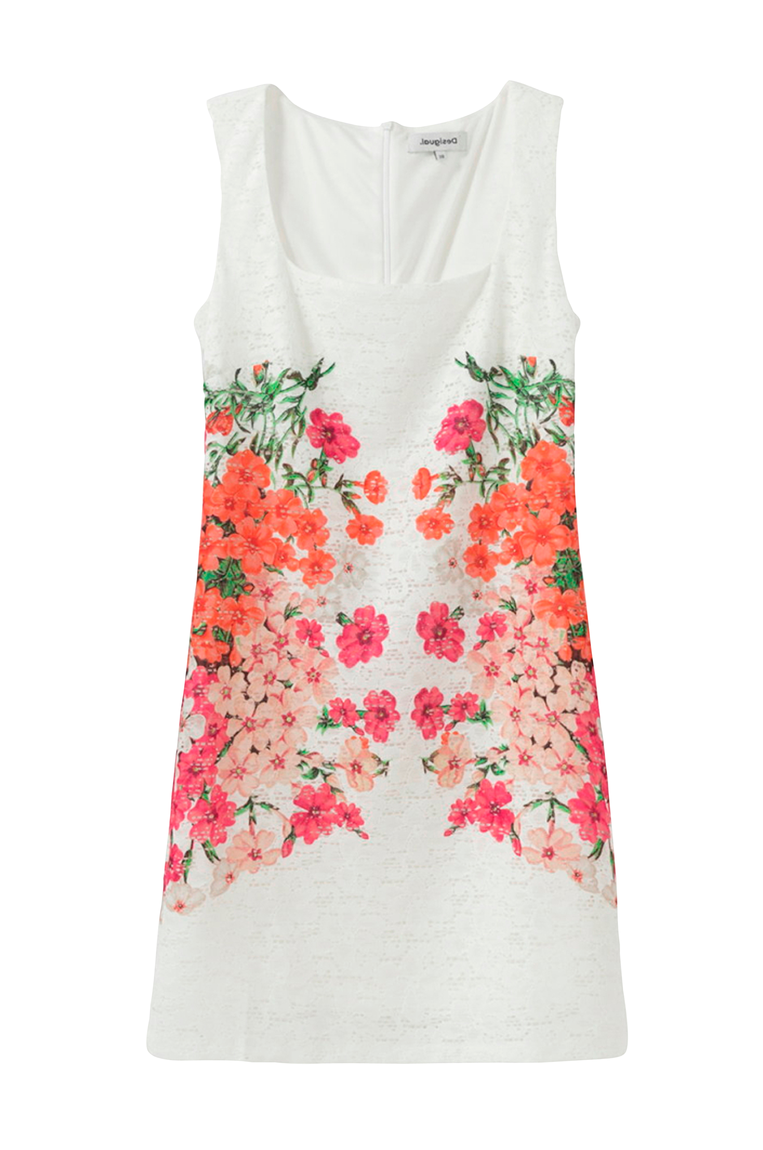 Lätt figurformad modell i genombruten spets med tryckt blommönster. Kantigt skuren hals och dold dragkedja i ryggen. Foder i trikå. Längd ca 88 cm i stl S.