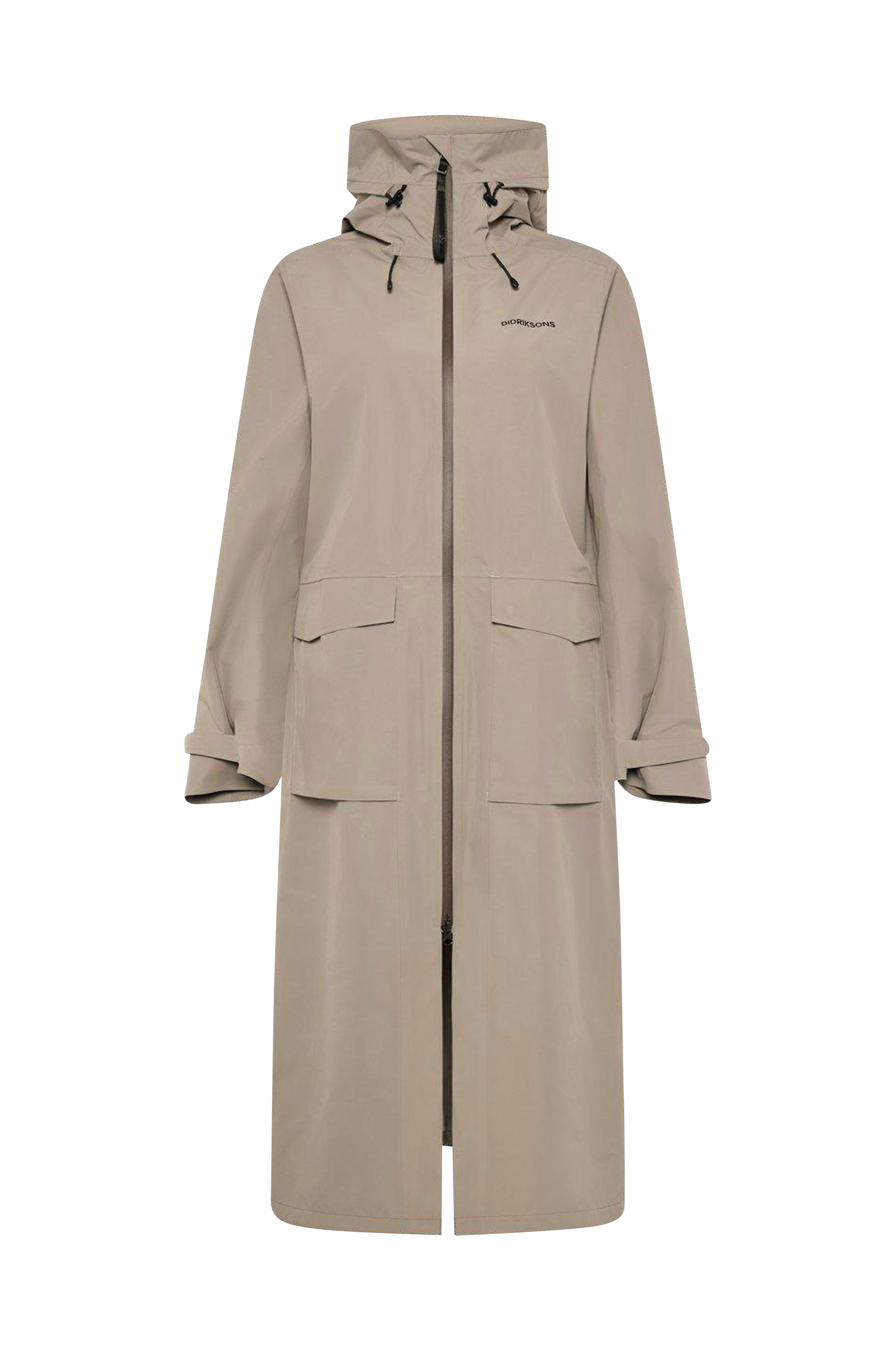 Lång jacka, mjuk och följsam, prasslar inte. Långa sprund fram och bak, går jättebra att cykla i den! Perfekt både på hundpromenad och på stan.