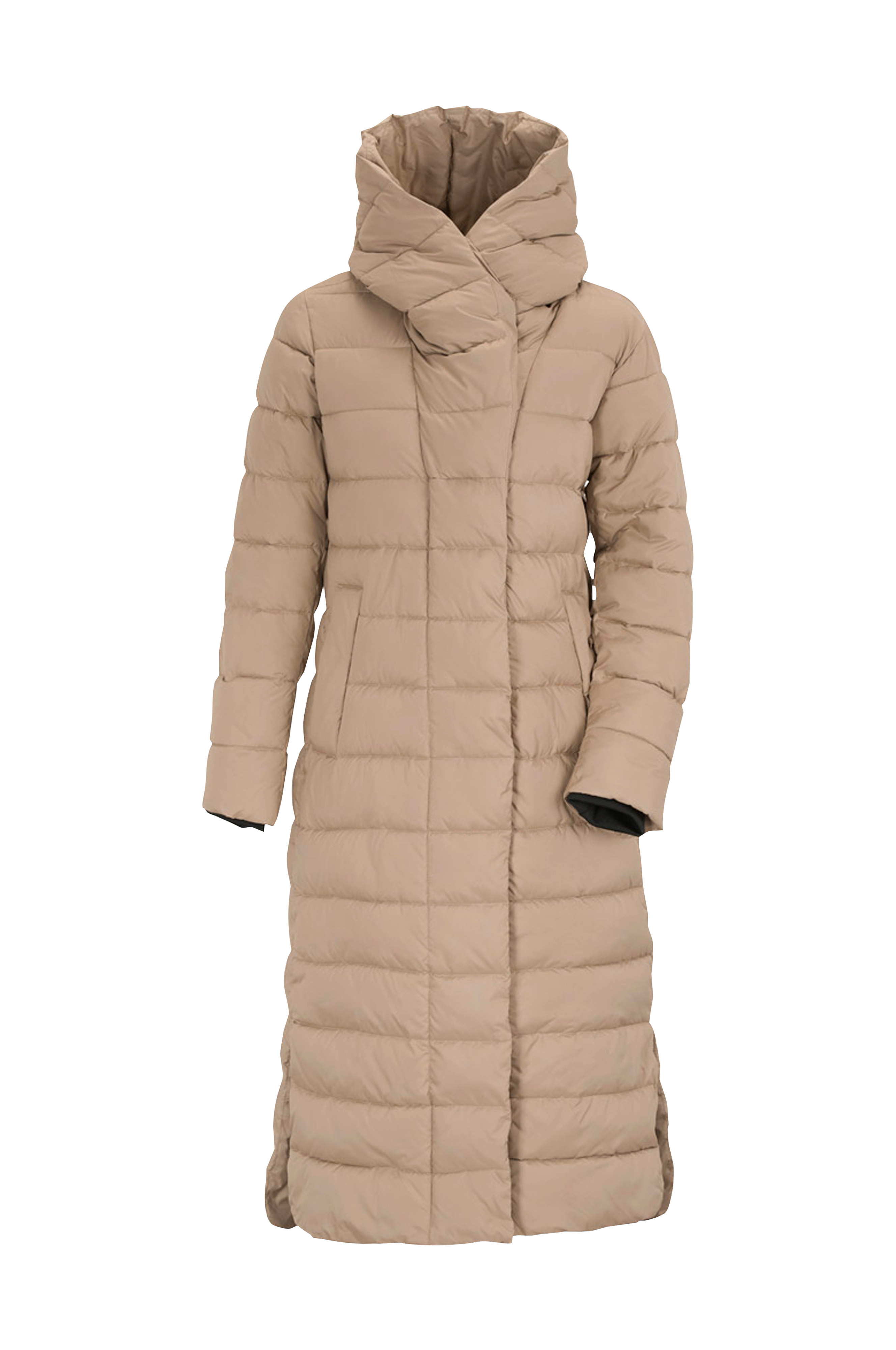 En lång, vattenavvisande puffkappa som värmer samtidigt som den är lätt och luftig. Yttermaterialet är gjort av 100% återvunnen polyester och vadderingen består av polyestervadd av lösa fibrer som isolerar värmen. Yttertyget har en slät och matt yta. Hög krage som övergår i en huva och en tvåvägsdragkedja från YKK med skyddande vindslå längs hela fronten. Två dragkedjefickor upptill fram. Ribbmuddar i ärmsluten. Reflex på insidan av ärmsluten som kan vikas upp. Slitsar i sidorna. Längd ca 118 cm i stl 36. PFC-fri vattenavvisning.