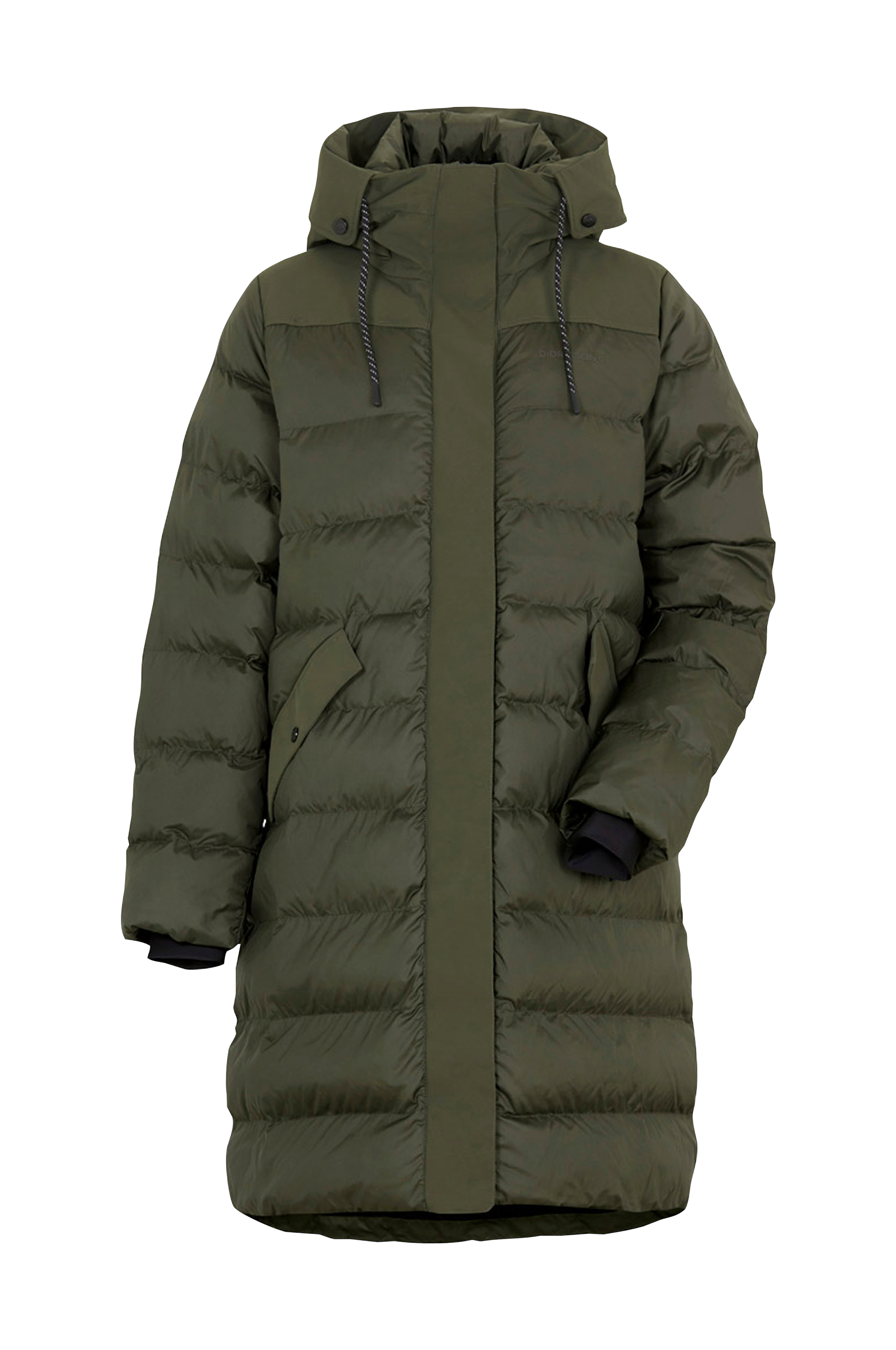 En A-linjeformad, vadderad parkas med bra andningsförmåga. Övre delen är tillverkad i ett vattentätt material medan resten av parkan är vattenavvisande. Av mjuk polyestertwill med matt yta och nylon med matt yta. Vadderad krage och en dekorativ huva med tryckknappar och reflekterande dragsko. Dragkedja och en skyddande vindslå med tryckknappar. Två fickor med lock och tryckknapp. Stretchiga trikåmuddar i ärmsluten. Längd ca 99 cm i stl 36. PFC-fri vattenavvisning.