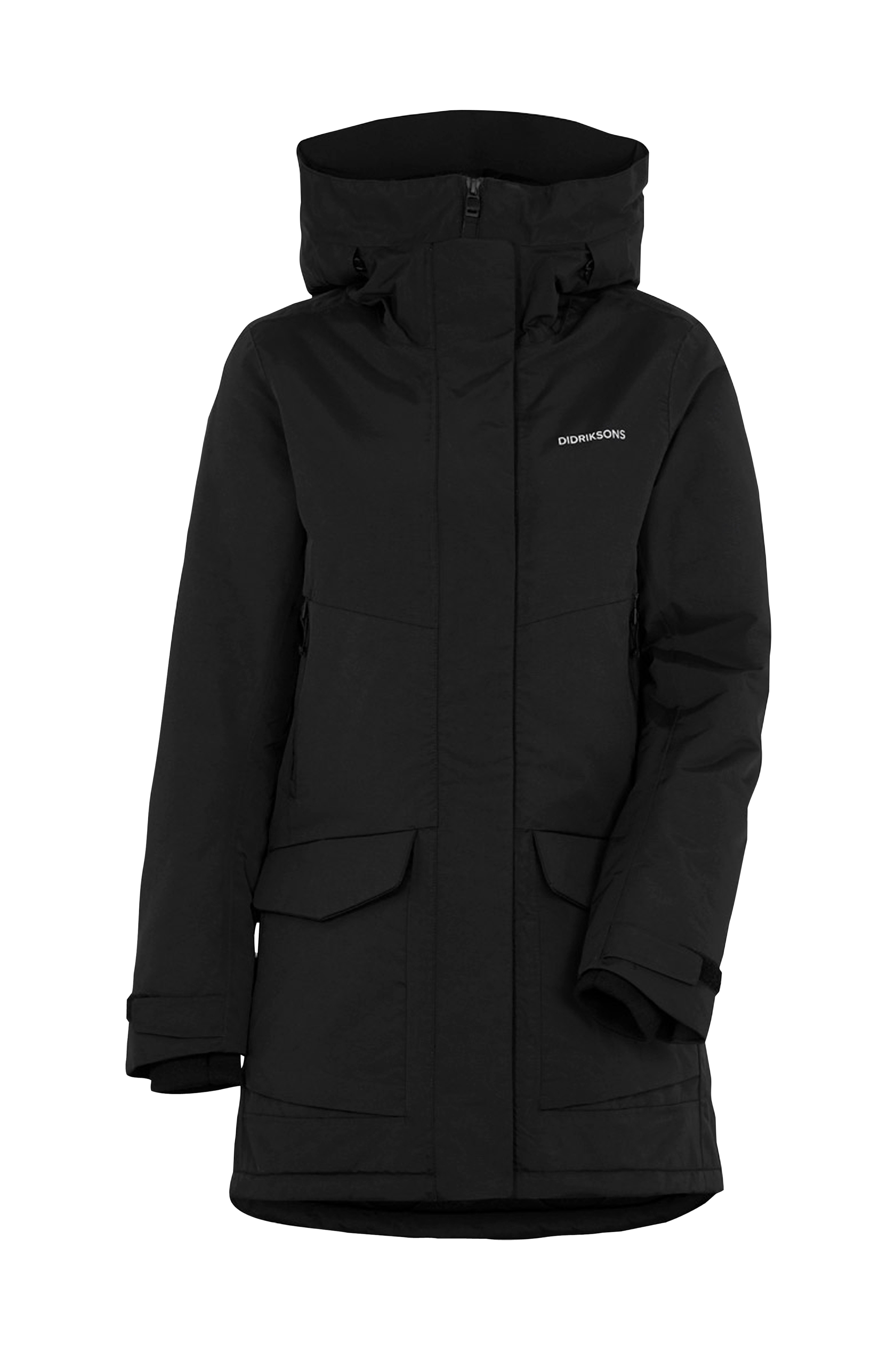 Fast, justerbar huva med skärm. Huvan har dragsko med stoppers. Hög krage med mjuk, borstad trikå på insidan fram. Stängning med tvåvägsdragkedja och en skyddande vindslå med tryckknappar. Invändig dragsko med stoppers i midjan. Reglerbar vidd i ärmslut med kardborreslejf. Ribbstickad innermudd i ärmslut med tumhål. Två stora fickor nedtill med lock och tryckknapp samt två fickor upptill med dragkedja. En innerficka i mesh och en praktisk napoleonficka med dragkedja på insidan av vindslån. Dragsko med stoppers i nederkanten. Längd bak 84,5 cm i stl M.
