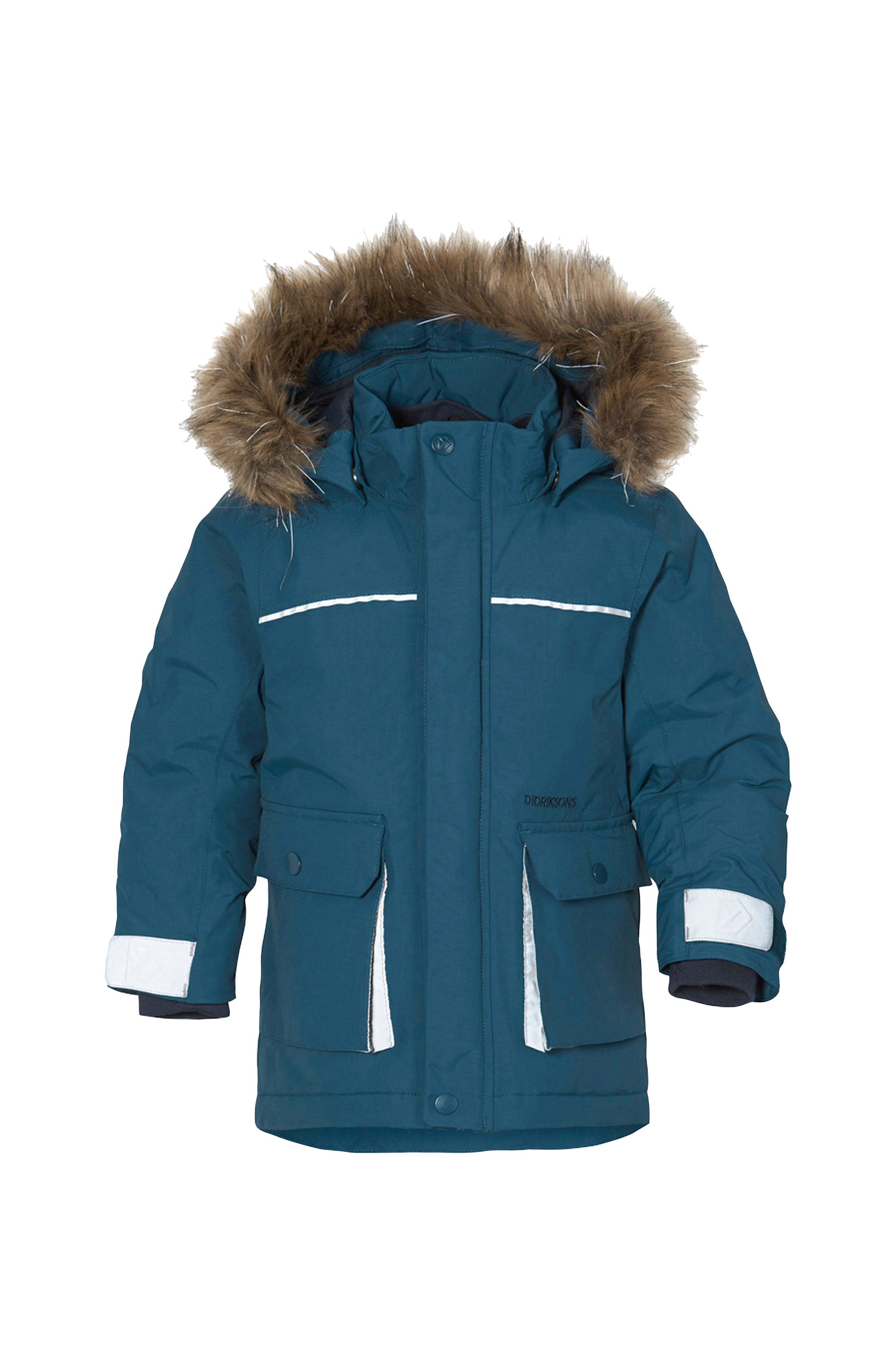 En varmt vadderad parkas som är helt vind- och vattentät med tejpade sömmar. Vaddering av återvunnen polyesterfiber med dunkänsla som isolerar värmen effektivt. Huvan och den syntetiska pälsen är avtagbara. Reflexdetaljer baktill samt vid de justerbara ärmsluten med kardborrestängning. Ribbmuddar i ärmsluten med tumhål . Två fickor framtill med lock och tryckknappsstängning. Plagget har funktionen "Extend Size" vilket innebär att ben och ärmar kan förlängas upp till en storlek. Vattenavvisningen är PFC-fri. Namnlapp på insidan med plats för flera namn.
