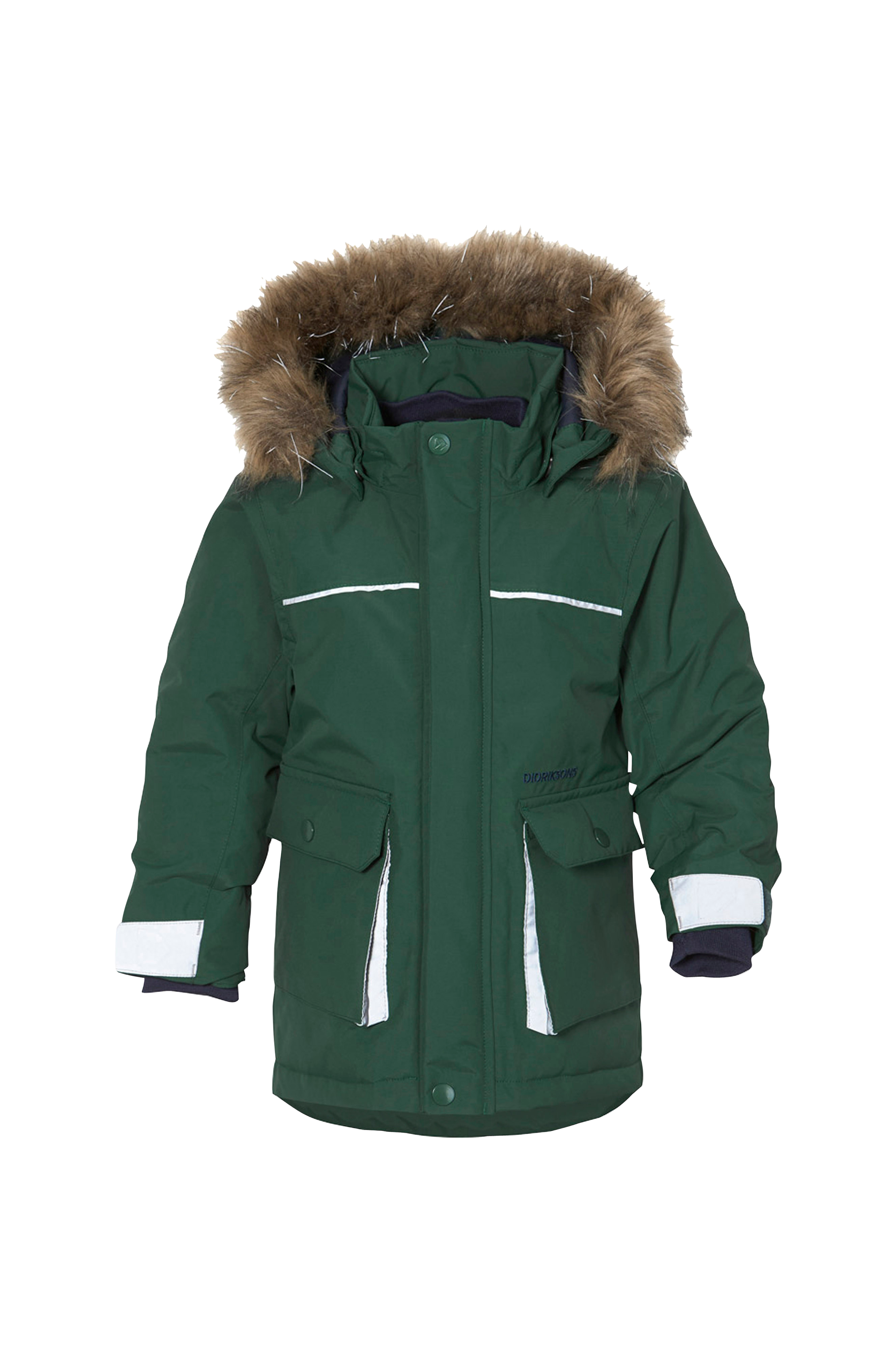En varmt vadderad parkas som är helt vind- och vattentät med tejpade sömmar. Vaddering av återvunnen polyesterfiber med dunkänsla som isolerar värmen effektivt. Huvan och den syntetiska pälsen är avtagbara. Reflexdetaljer baktill samt vid de justerbara ärmsluten med kardborrestängning. Ribbmuddar i ärmsluten med tumhål . Två fickor framtill med lock och tryckknappsstängning. Plagget har funktionen "Extend Size" vilket innebär att ben och ärmar kan förlängas upp till en storlek. Vattenavvisningen är PFC-fri. Namnlapp på insidan med plats för flera namn.