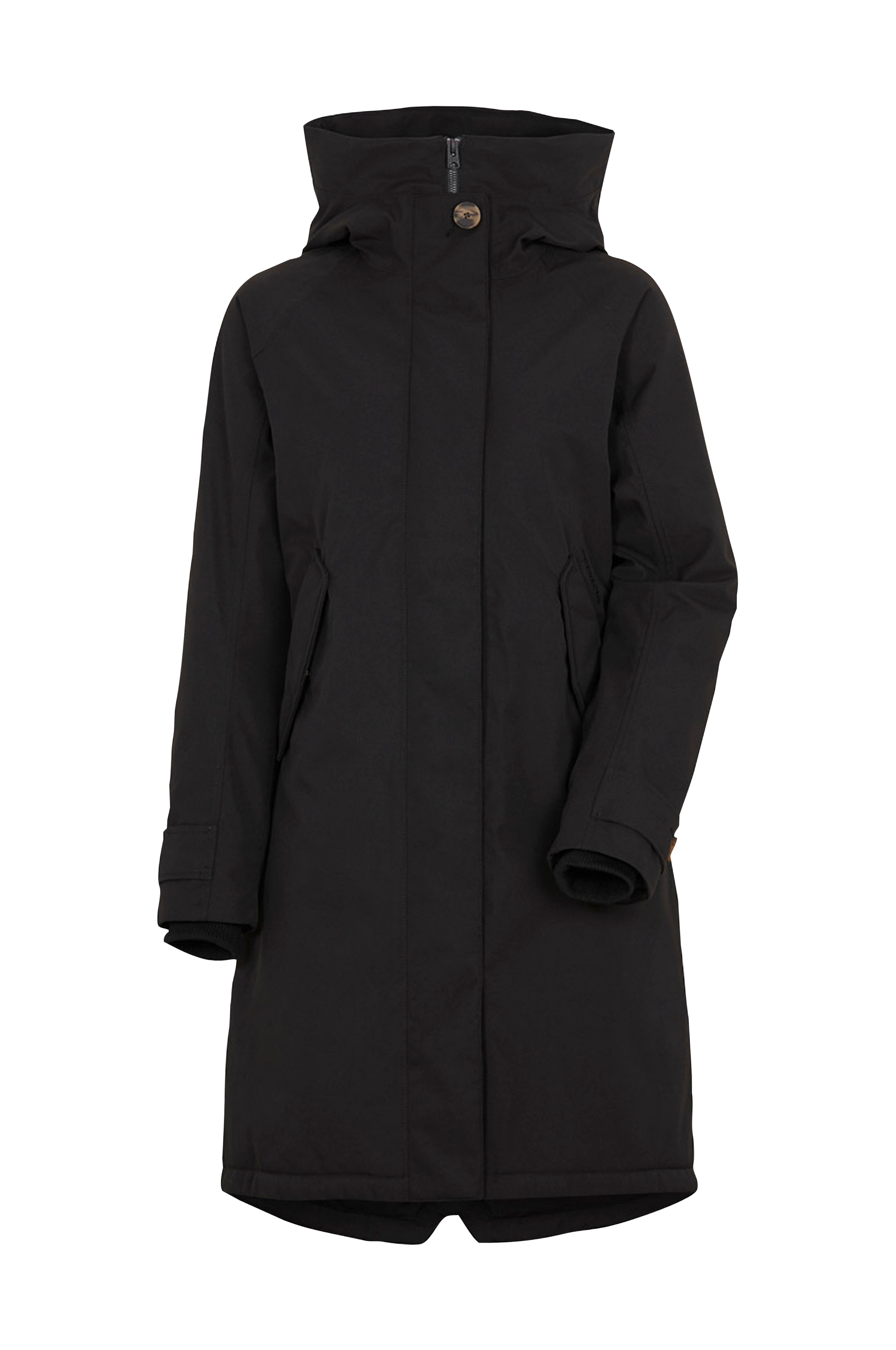 Fast, justerbar huva. Hög krage med mjuk, borstad polyester vid hakan. Parkasen stängs med tvåvägsdragkedja och en skyddande vindslå med tryckknappar. Två fickor med dolda tryckknappstängning och mjukt, borstat foder. En napoleonficka under vindslån med dragkedja. Två innerfickor, en öppen och en med knapp. Invändiga, ribbstickade muddar i ärmsluten. Vidden i ärmsluten kan justeras. Dragsko med stoppers i midjan och nederkanten. PFC-fri vattenavvisning. Längd ca 101 cm i stl 36.