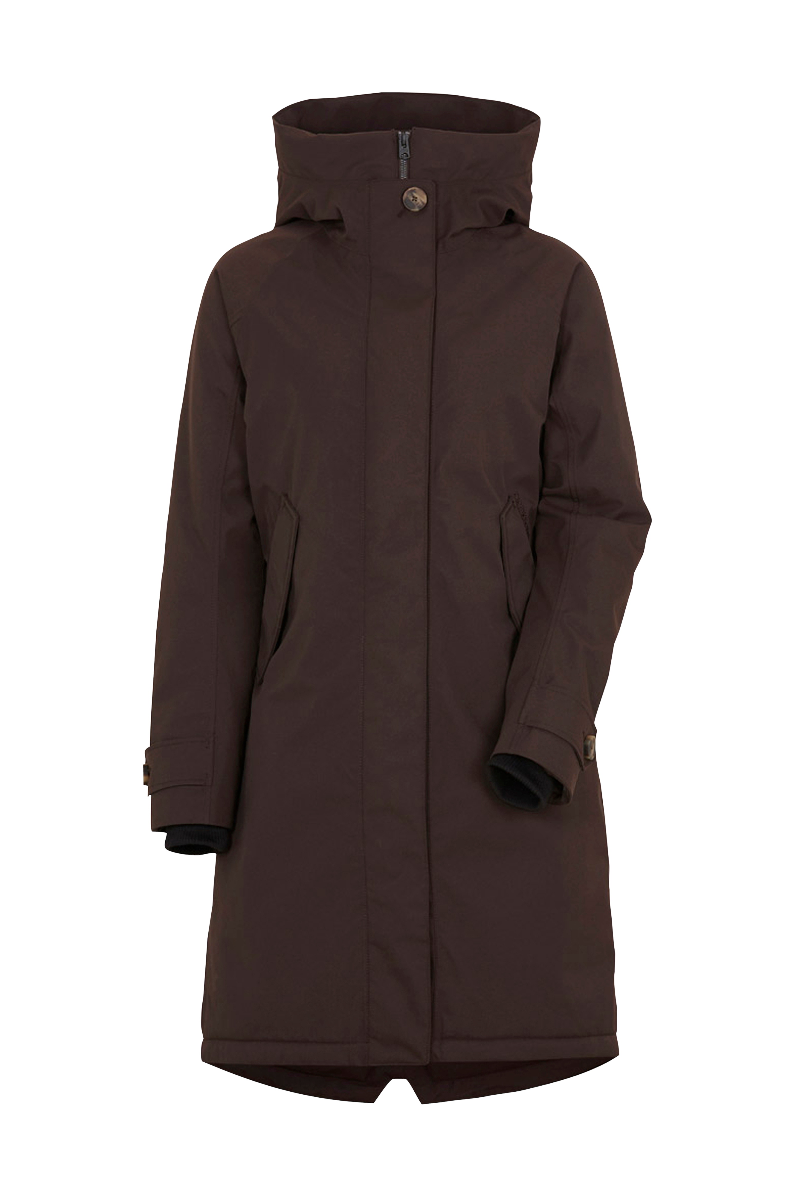 Fast, justerbar huva. Hög krage med mjuk, borstad polyester vid hakan. Parkasen stängs med tvåvägsdragkedja och en skyddande vindslå med tryckknappar. Två fickor med dolda tryckknappstängning och mjukt, borstat foder. En napoleonficka under vindslån med dragkedja. Två innerfickor, en öppen och en med knapp. Invändiga, ribbstickade muddar i ärmsluten. Vidden i ärmsluten kan justeras. Dragsko med stoppers i midjan och nederkanten. PFC-fri vattenavvisning. Längd ca 101 cm i stl 36.