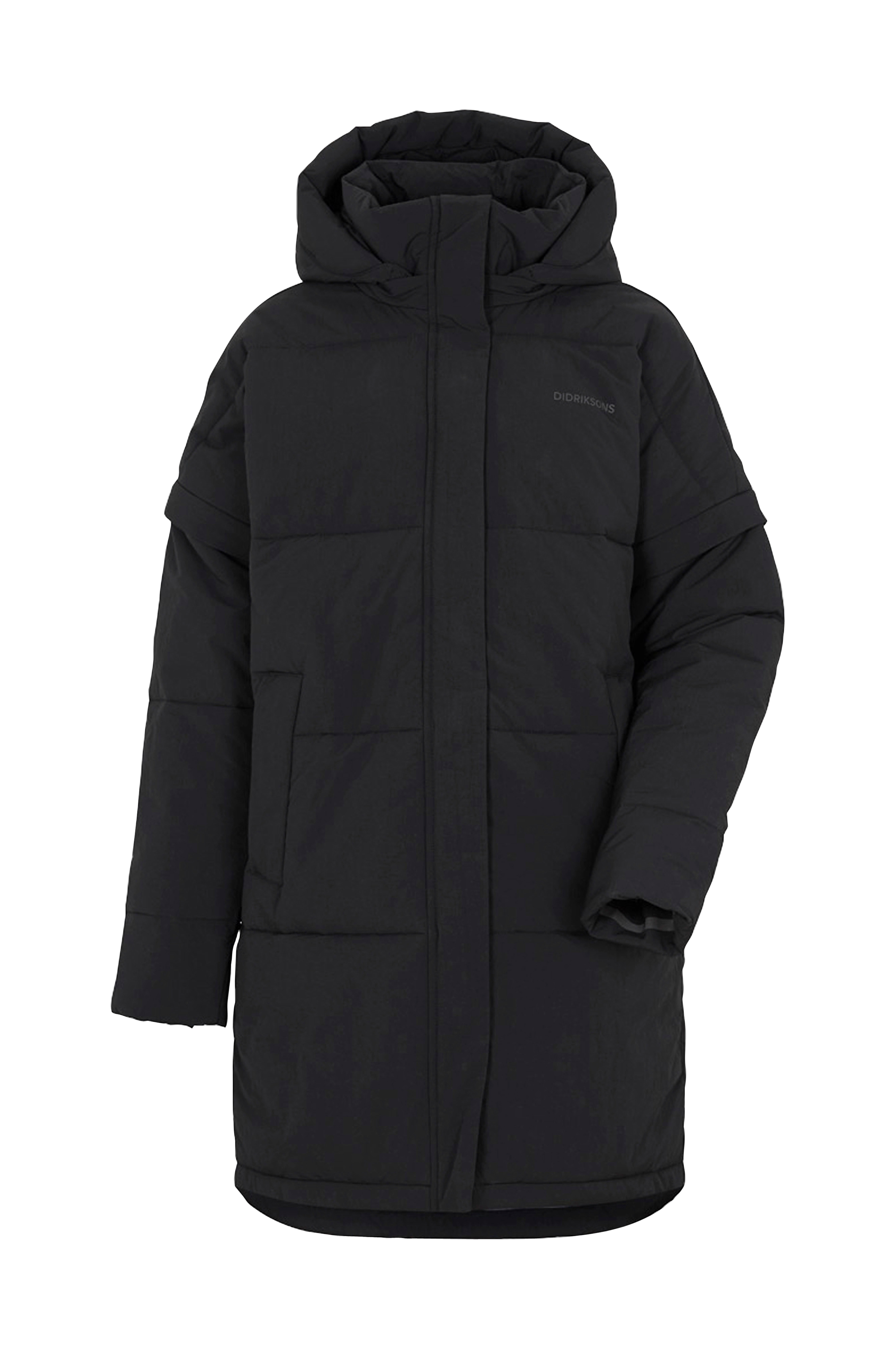 En vadderad, vindtät och vattenavvisande puffparkas. Den långa parkasmodellen ger mer värme jämfört med en kortare jackmodell. Parkans ärmar är avtagbara tack vare en dragkedjefunktion. Reflexdetaljer.