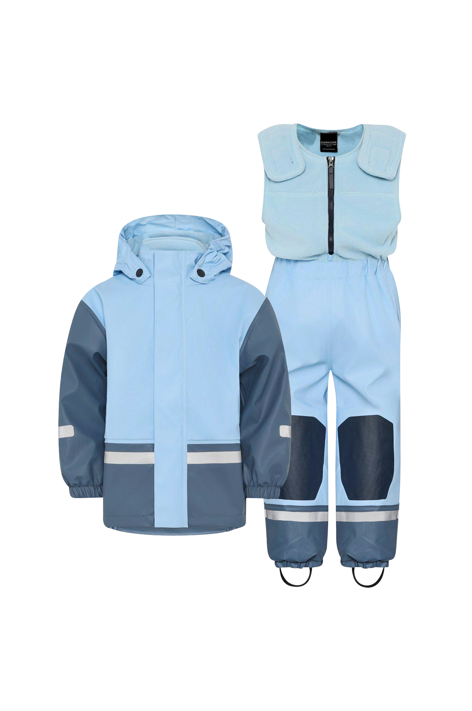 Fin uppsättning, tål mycket slitage och regn. Jag tyckte byxorna var lite små, men det berodde på att jag trodde vi beställde 116 och inte 110. Men jackan passade väldigt bra på barnet som är 112…