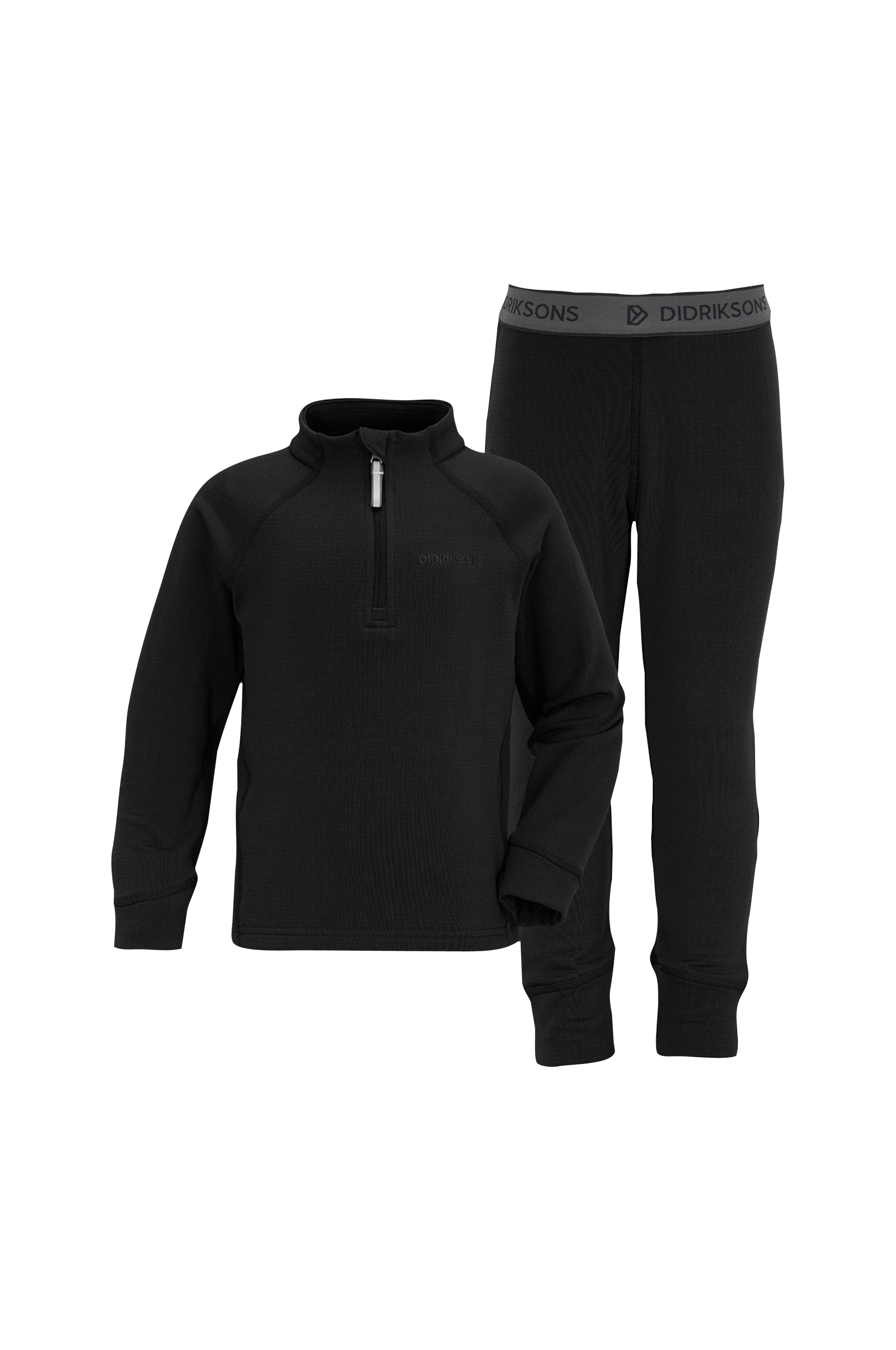 Underställ med tröja och byxa. Understället är tillverkat i mjuk trikå med fyrvägsstretch och mjuk, borstad insida. Tröjan har en hög krage och kort dragkedja med skavskydd vid hakan. Muddar i ärmsluten. Byxan har en påsydd resårlinning med vävd logotyp samt muddar i bensluten.