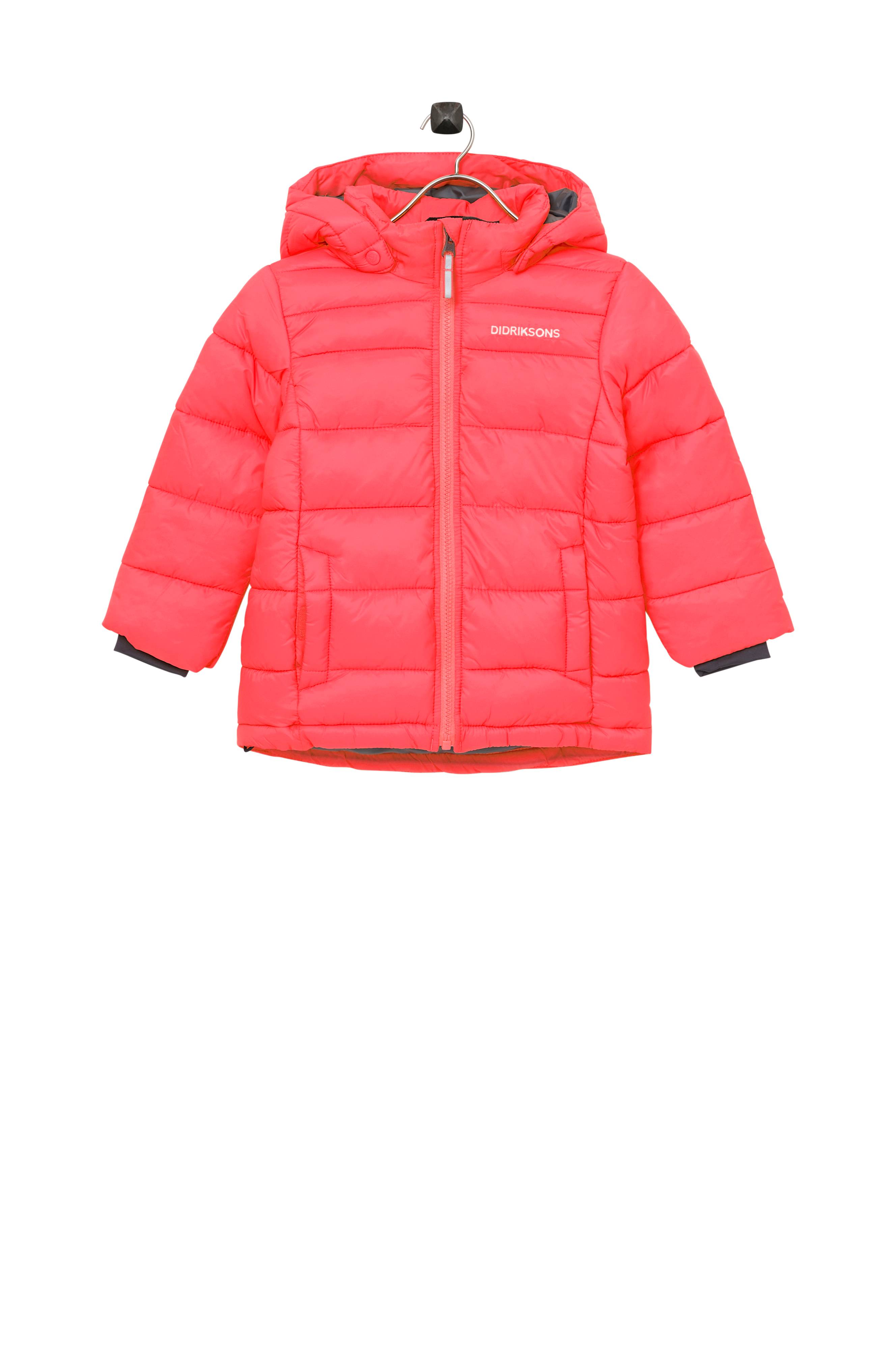 • Vadderad jacka • Vattenavvisande, vindtätt material • Dragkedja fram • Två fickor med kardborrefäste • Avtagbar huva • Reflexdetaljer • Trikåmudd med tumhål i ärmsluten • Produkten har en vattenavvisande behandling som är snällare mot miljön och fri från tillsatta perfluorerade ämnen (PFC). Du kan behöva återaktivera impregneringen om vattnet slutar pärla sig på ytan. Detta gör du genom att tillsätta värme på låg temperatur genom te.x. strykning eller torktumling. Vid behov kan även impregneringspreparat behövas.