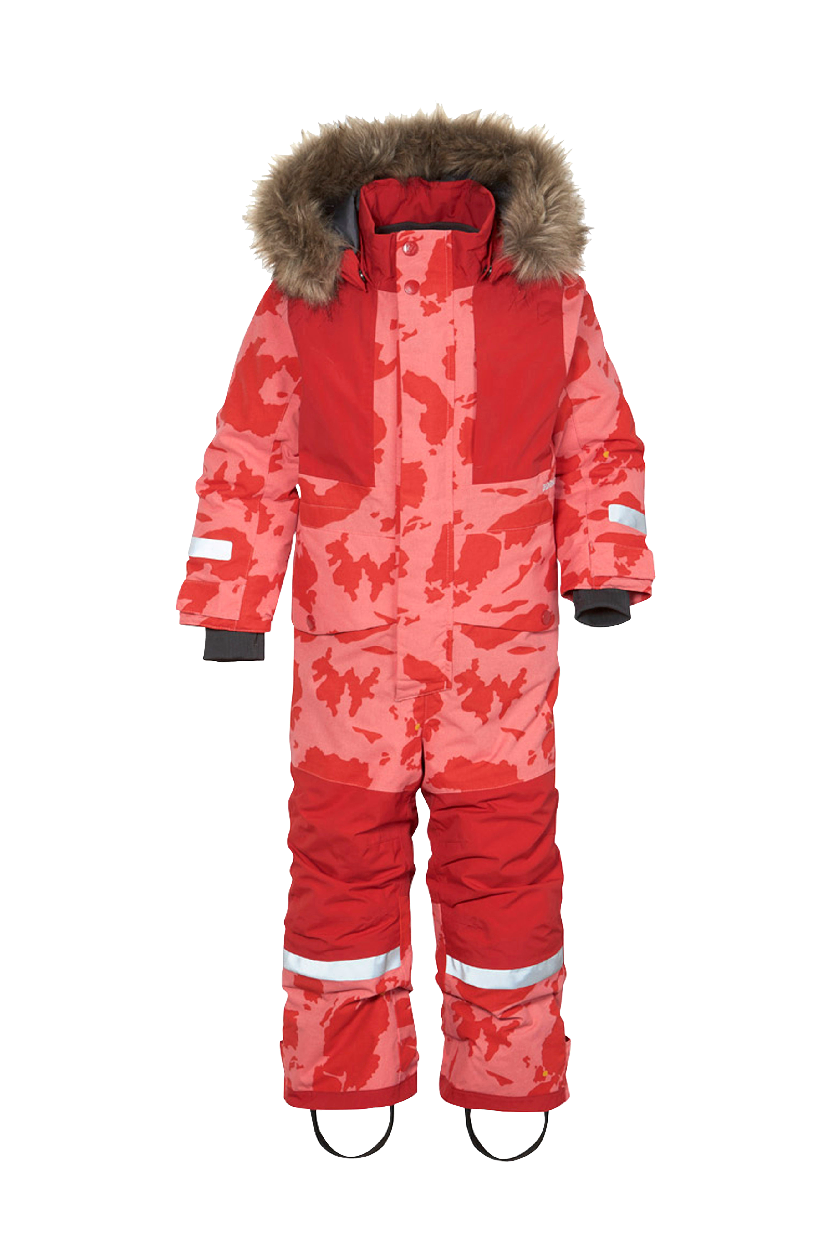 Justerbar, avknäppbar huva med avtagbar fuskpälskant. Hög krage med knäppning. Borstad, mjuk polyester på insidan av kragen vid hakan. Stängning med dragkedja och en skyddande vindslå över dragkedjan med kardborreknäppning. Overallen har två rymliga fickor framtill med tryckknappar samt en mindre ficka på bröstet med dragkedja. Elastiska, ribbade muddar i ärmslut med tumhål och en hake att fästa vanten i. Midja, ärmslut och benslut kan justeras för en förstärkt passform. Snölås i bensluten och elastiska, avtagbara fothällor. Reflexdetaljer.