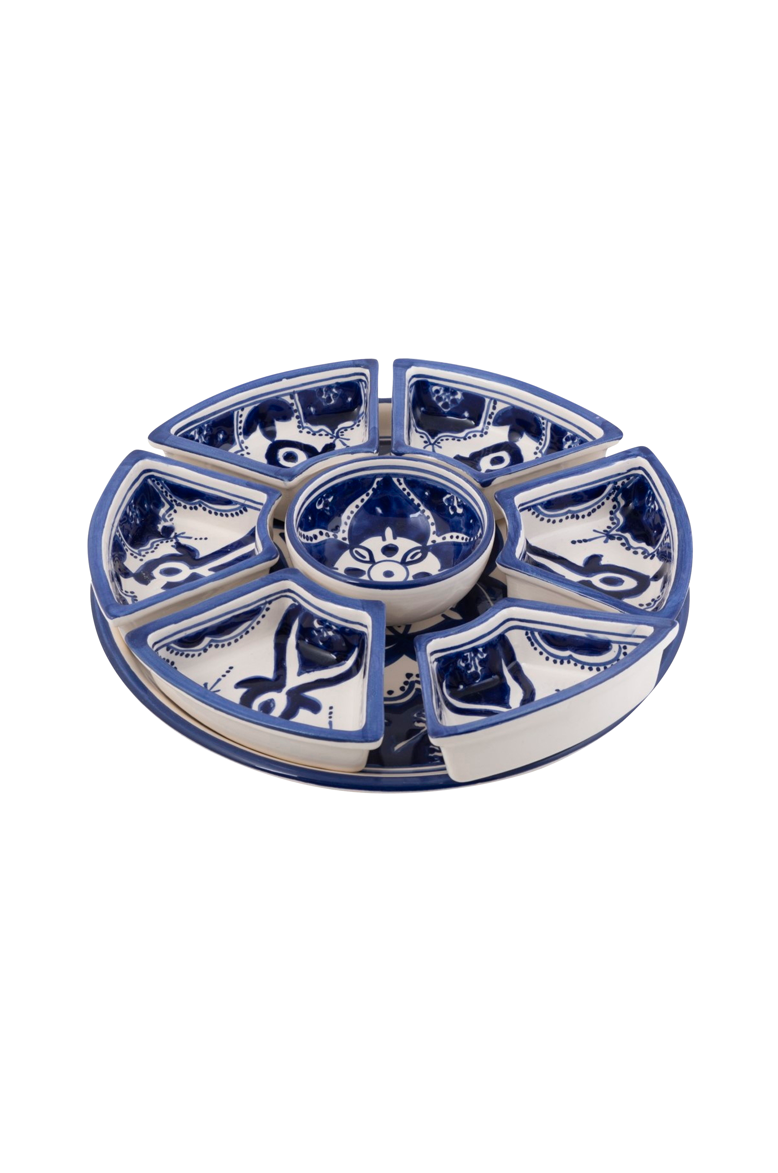 Ett elegant och praktiskt tapasfat! Ett sådant fat kan vara perfekt för att servera olika tapasrätter eller aptitretare under en måltid eller på ett evenemang. Tapasuppsättningen innehåller 1x tallrik, 1x6 cm skål och 6x sidoskålar. dishes & deco-produkter är handgjorda och handmålade i Tunisien och alla deras serveringsfat/skålar är tillverkade av hållbar vit stengodslera. Tål ugn, mikrovågsugn och diskmaskin.