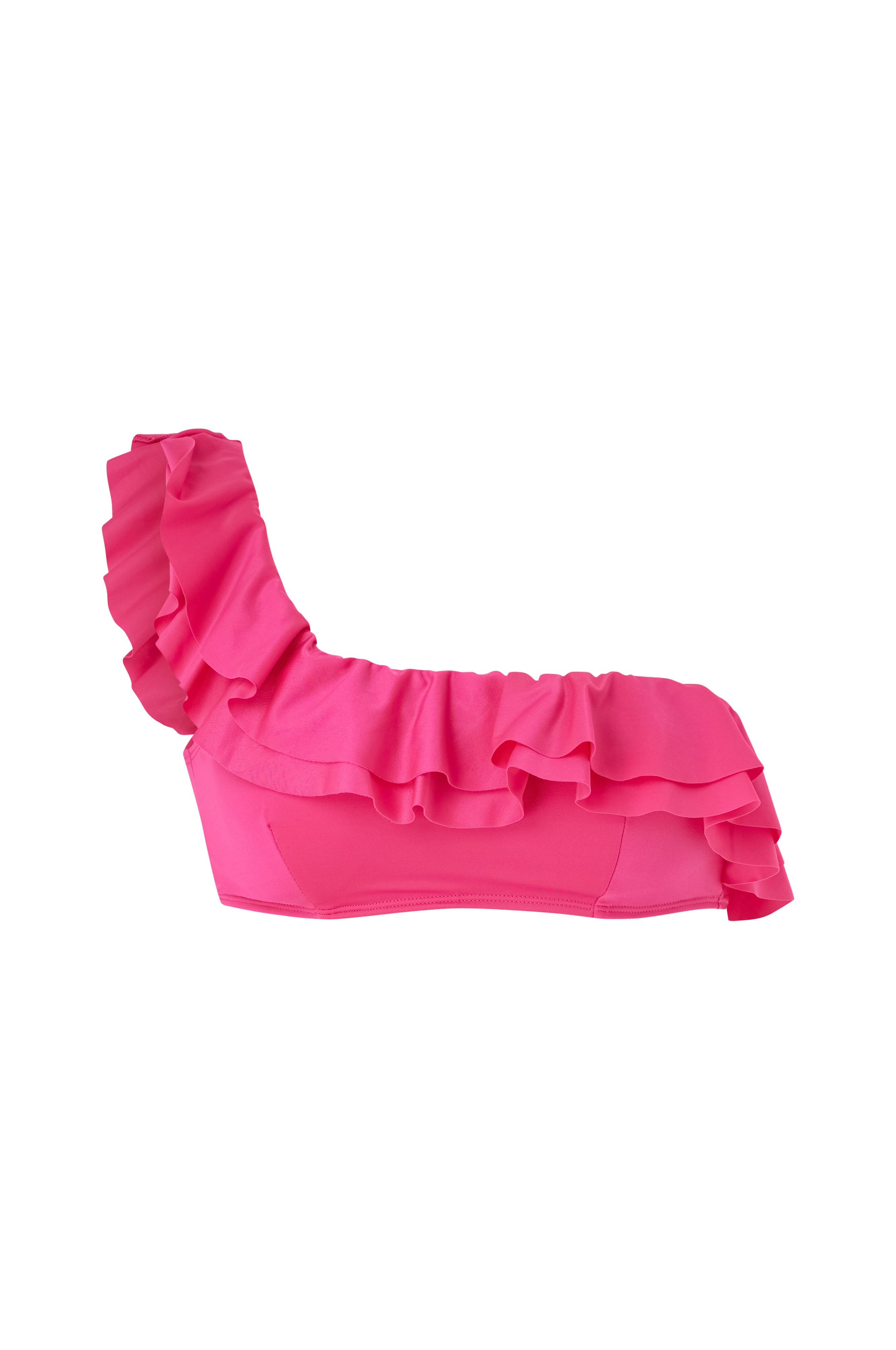 • Formpressad, uttagbar vaddering• Asymmetrisk överdel med ett axelband och påsydda volanger