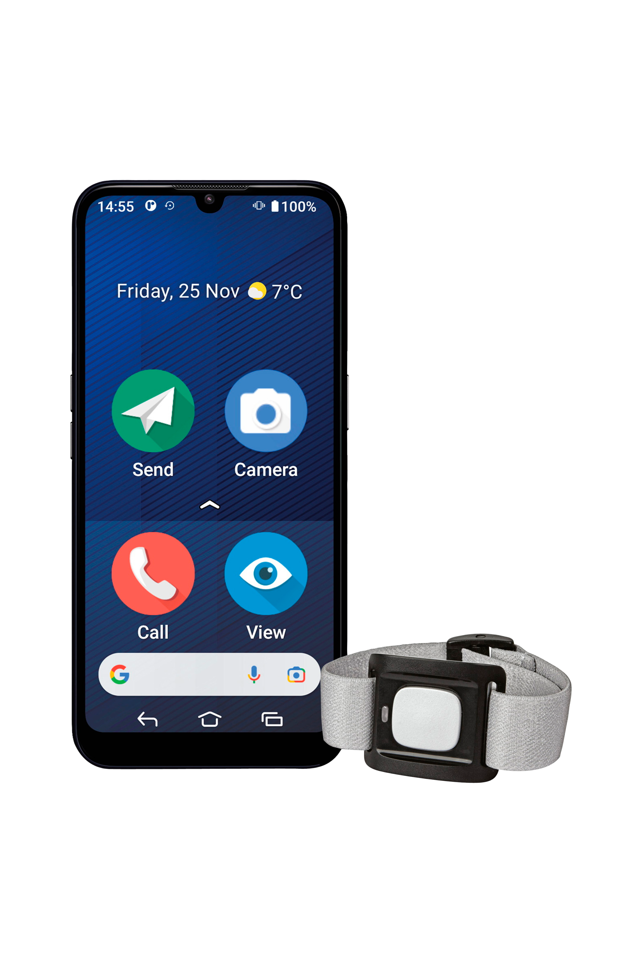 Lättanvänd mobil med större ikoner och extra larmknapp för handleden. Larmknappen är vattentålig och kan bäras även i duschen. Skickar larm till anhöriga som kopplas upp direkt.