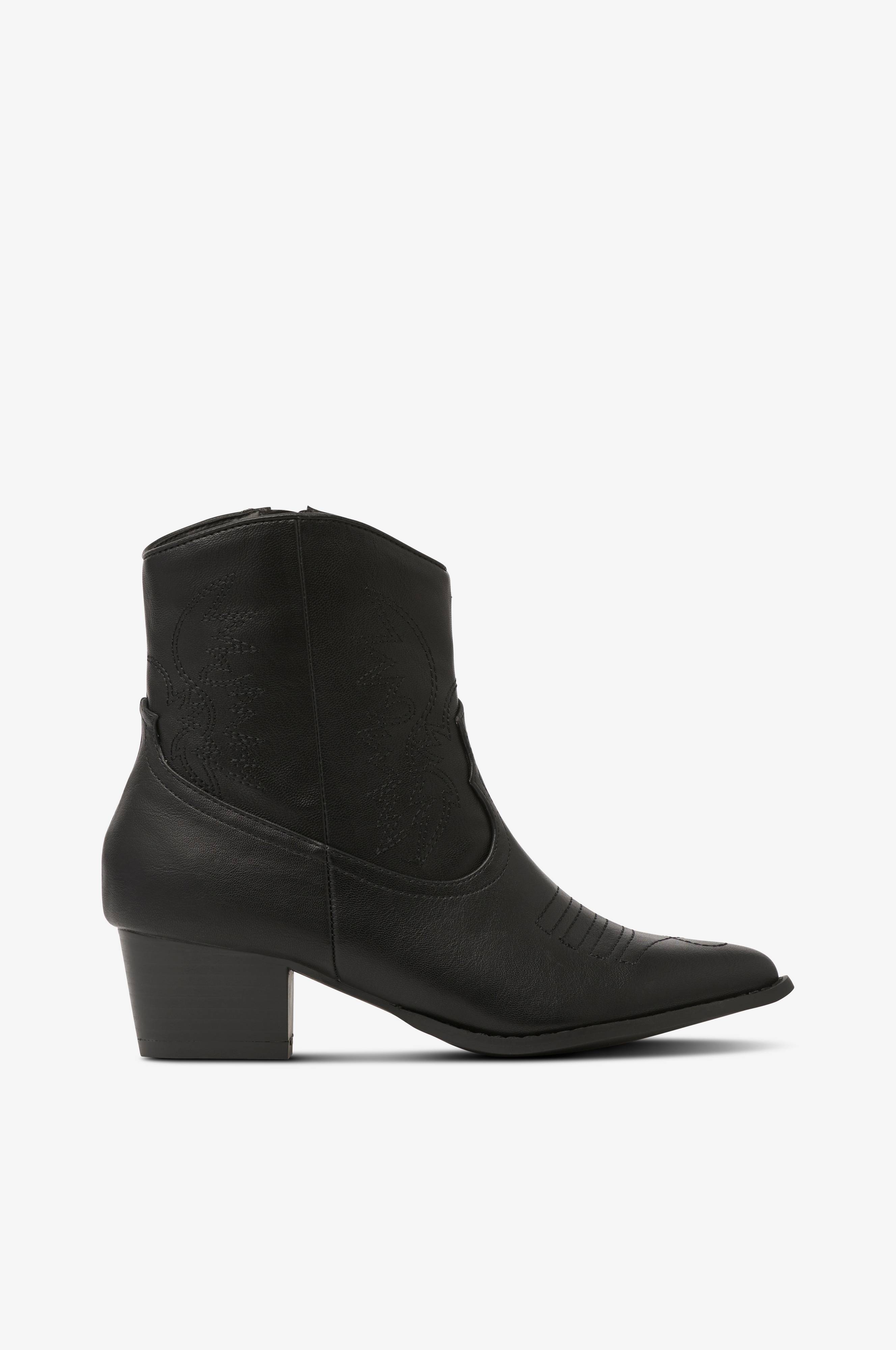 Boots från Duffy. Snygg cowboyinspirerad modell med dekorstickningar på tån och på skaftet. Rundad överdel och dragkedja på insidan samt träliknande klack. Av skinnimitation med foder i textil. Klackhöjd ca 5 cm. Skafthöjd bak ca 14 cm.