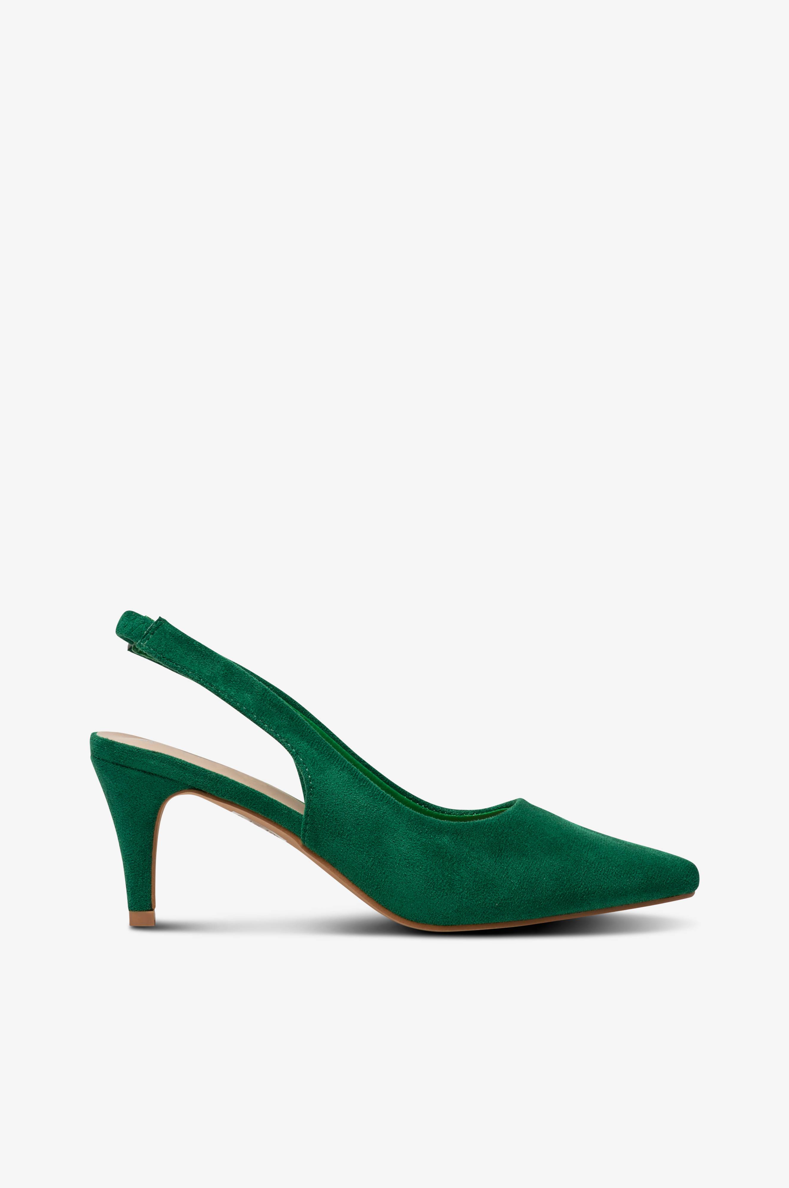 Pumps i textil med matt, borstad finish. Spetsig tåform och klädd klack. Mjukstoppad fotbädd i skinnlook. Ankelrem med resår baktill. Klackhöjd ca 6 cm.