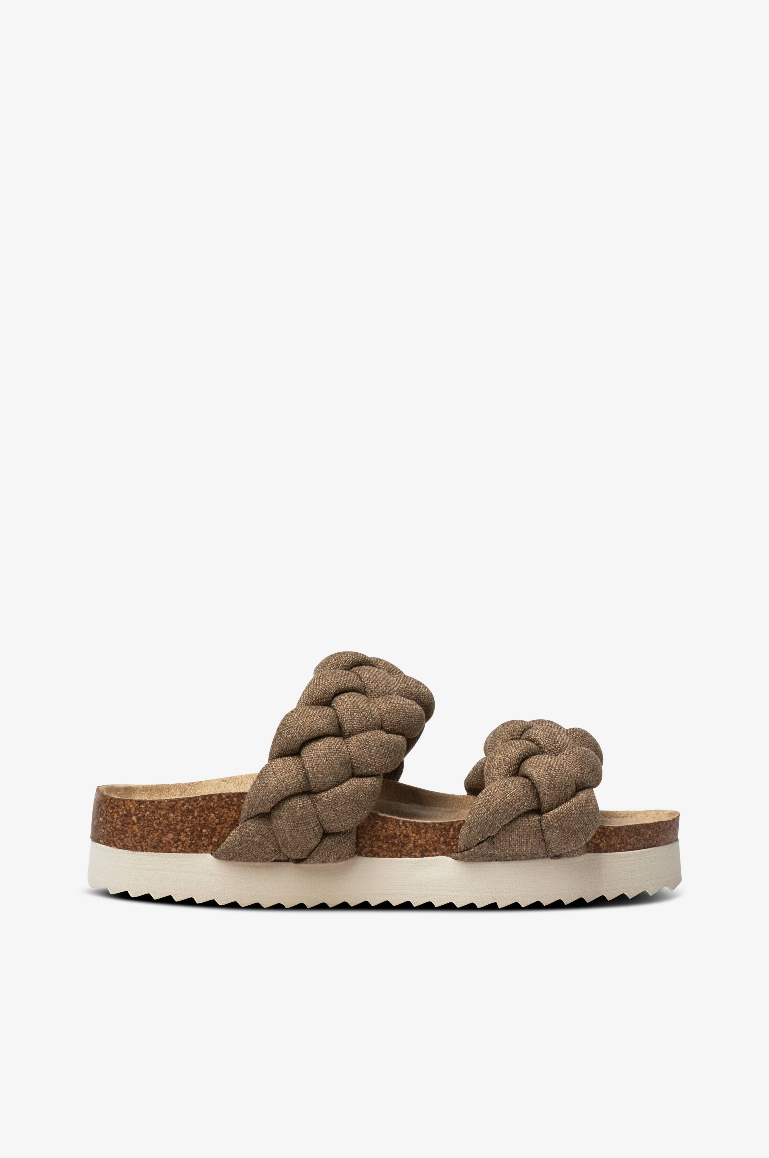Sandaler med plattformsula och två vadderade, flätade remmar över foten. Yttersula i lättviktig EVA. Sulhöjd ca 4 cm.