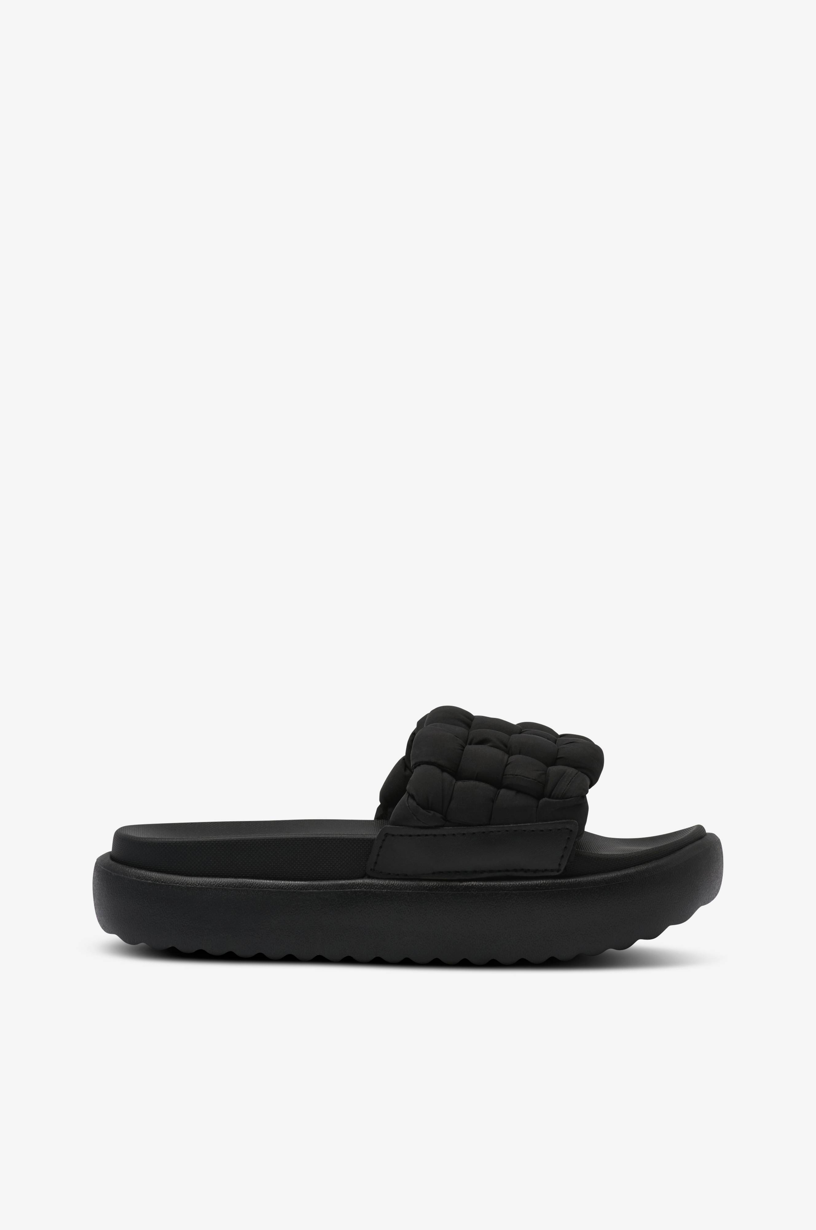 • Slip on-modell• Flätad rem i vadderad, mjuk textil• Mjuk fotbädd• Yttersula i syntet• Sulhöjd: 4 cm