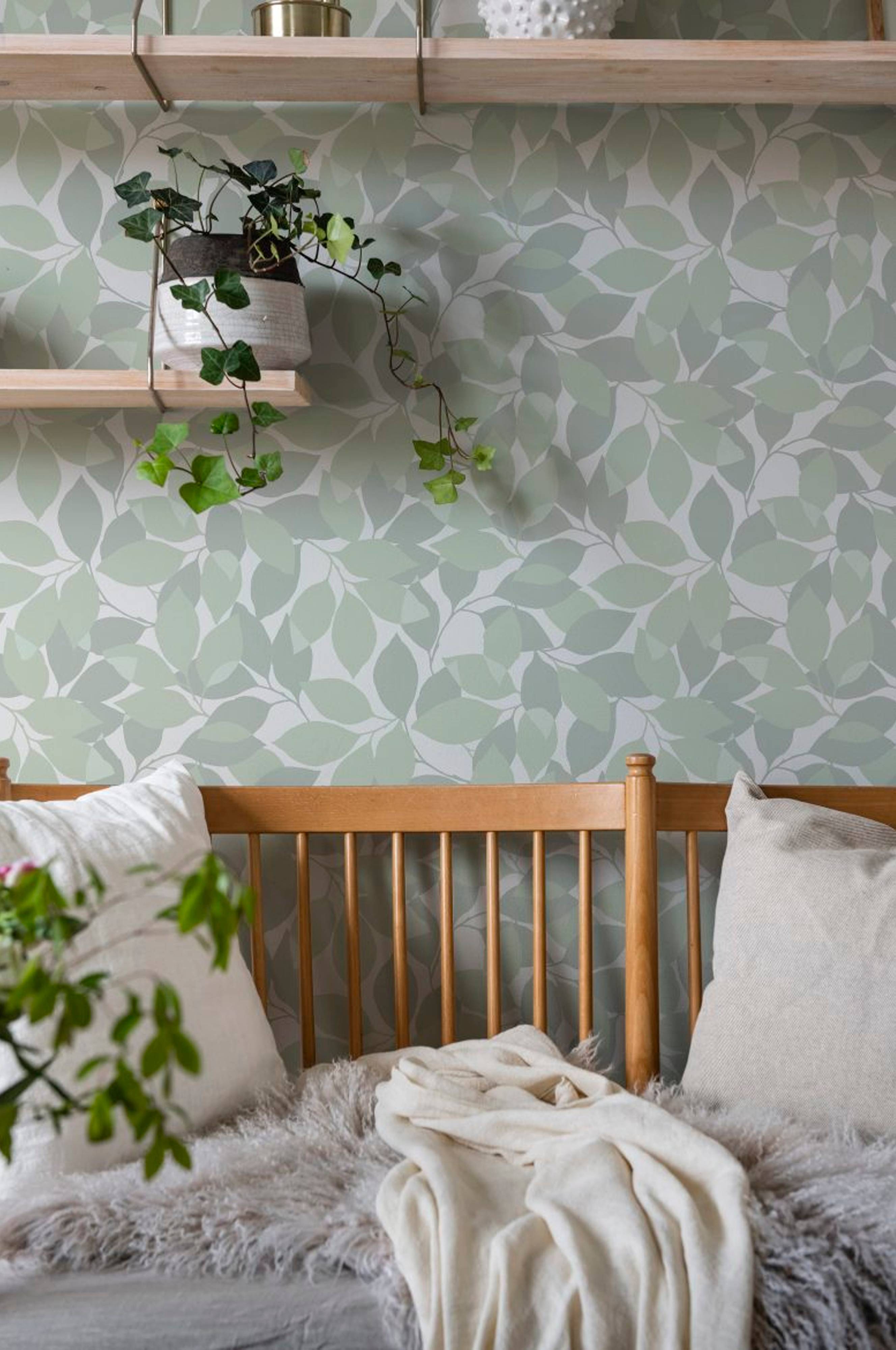 Den fylliga sensommargrönskan och dess täta bladverk har gett inspiration till tapeten Augusti. Non woven-lim på väggen, rak mönsterpassning 26,5 cm