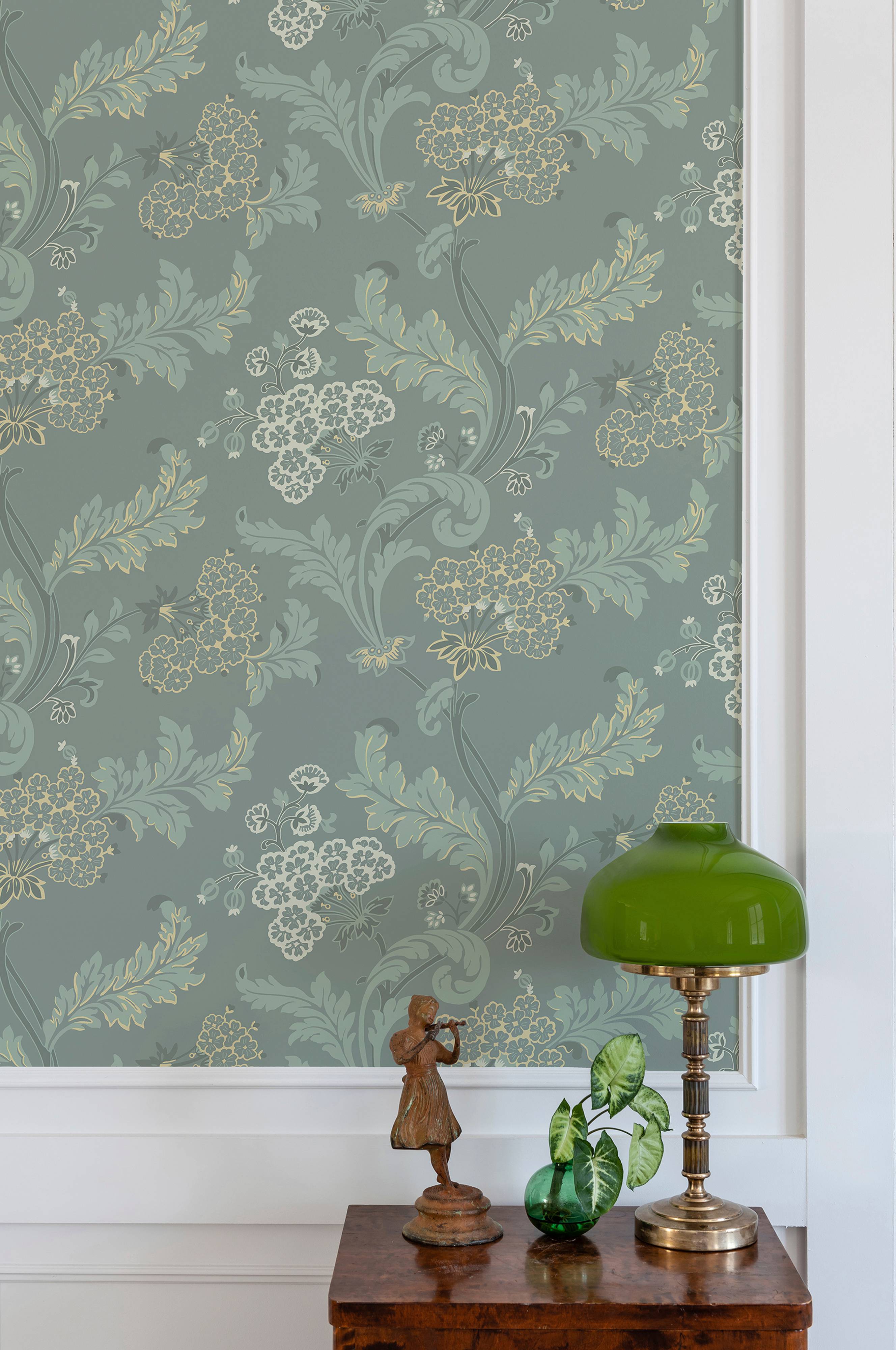 En QuickUp-tapet (non-woven material). Lätt att tapetsera, limmas direkt på väggen. Tapeten är producerad i Sverige. Den tillverkas med hänsyn till vår miljö, tål att tvättas med tvål och vatten och har en hög ljushärdighet. Rullängd 10,05 m, bredd 53 cm. Förskjuten mönsterpassning 26,5 cm