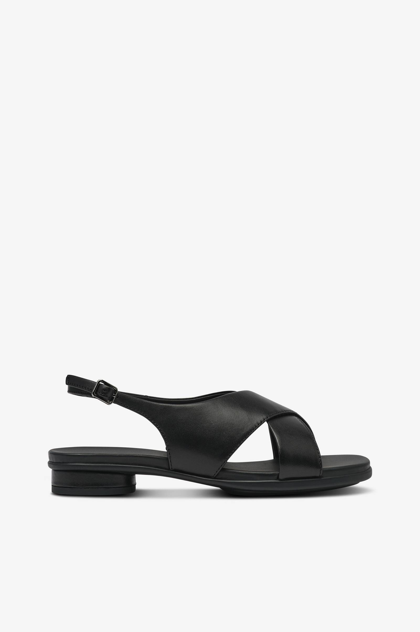 • Remmar i läder• Justerbar rem med spänne runt hälen• Rund, låg klack
