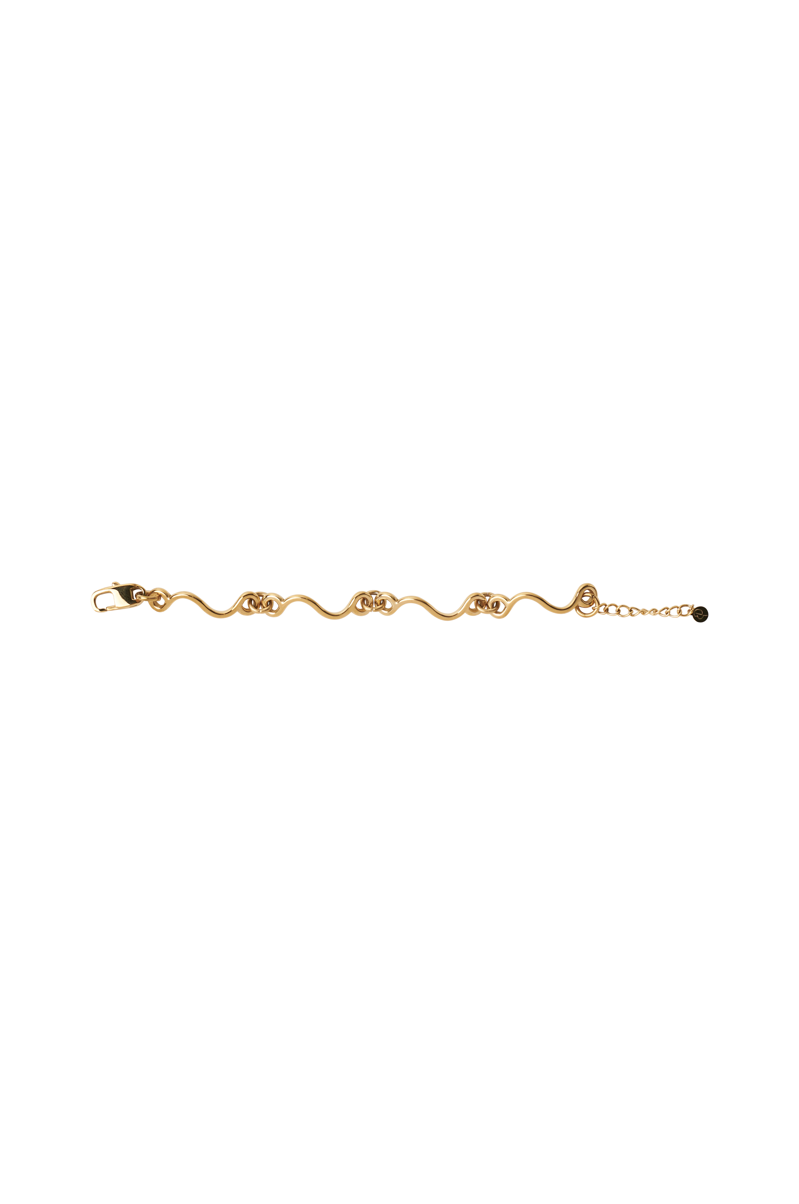 Stream har en intressant design med rörelse där smyckena följer i svängar. Stream armband har fyra svängda länkar. Blank 14K guldplätering på rostfritt stål. Bredd 8 mm. Armbandets justerbara längd 16-19 cm. Nickelsäkert.