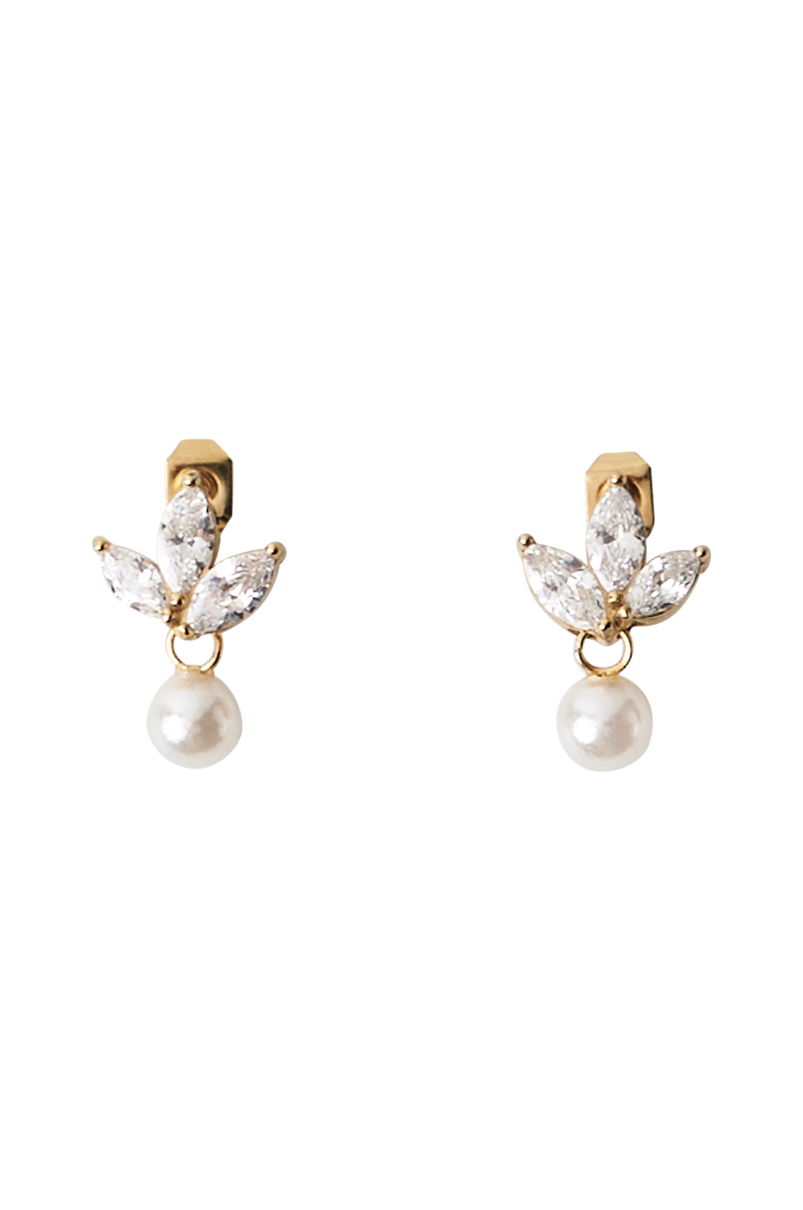 Små örhängen med tre blad och en rund pärla. Gjorda i rostfritt stål med blank 14 k guldplätering.Längd ca 16 mm.