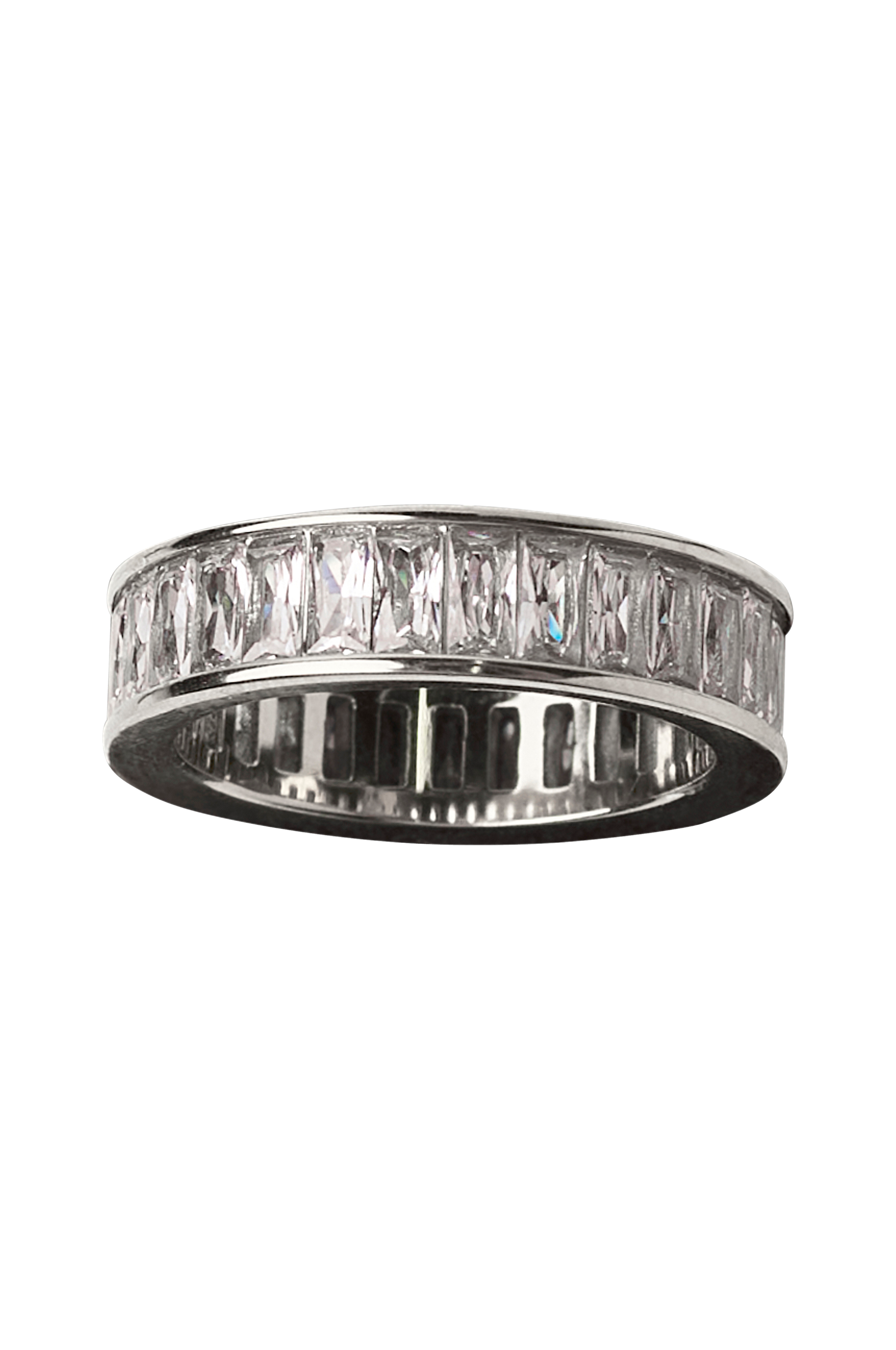 Radiant ring har vackra baguetteformade stenar satta runt hela ringen och en infattning som låter ljuset lysa igenom. Radiant ring blir en favorit som du bär både till vardag och fest. Bredd 5 mm, höjd 2 mm. Blankt, rostfritt stål. Nickelsäkert.