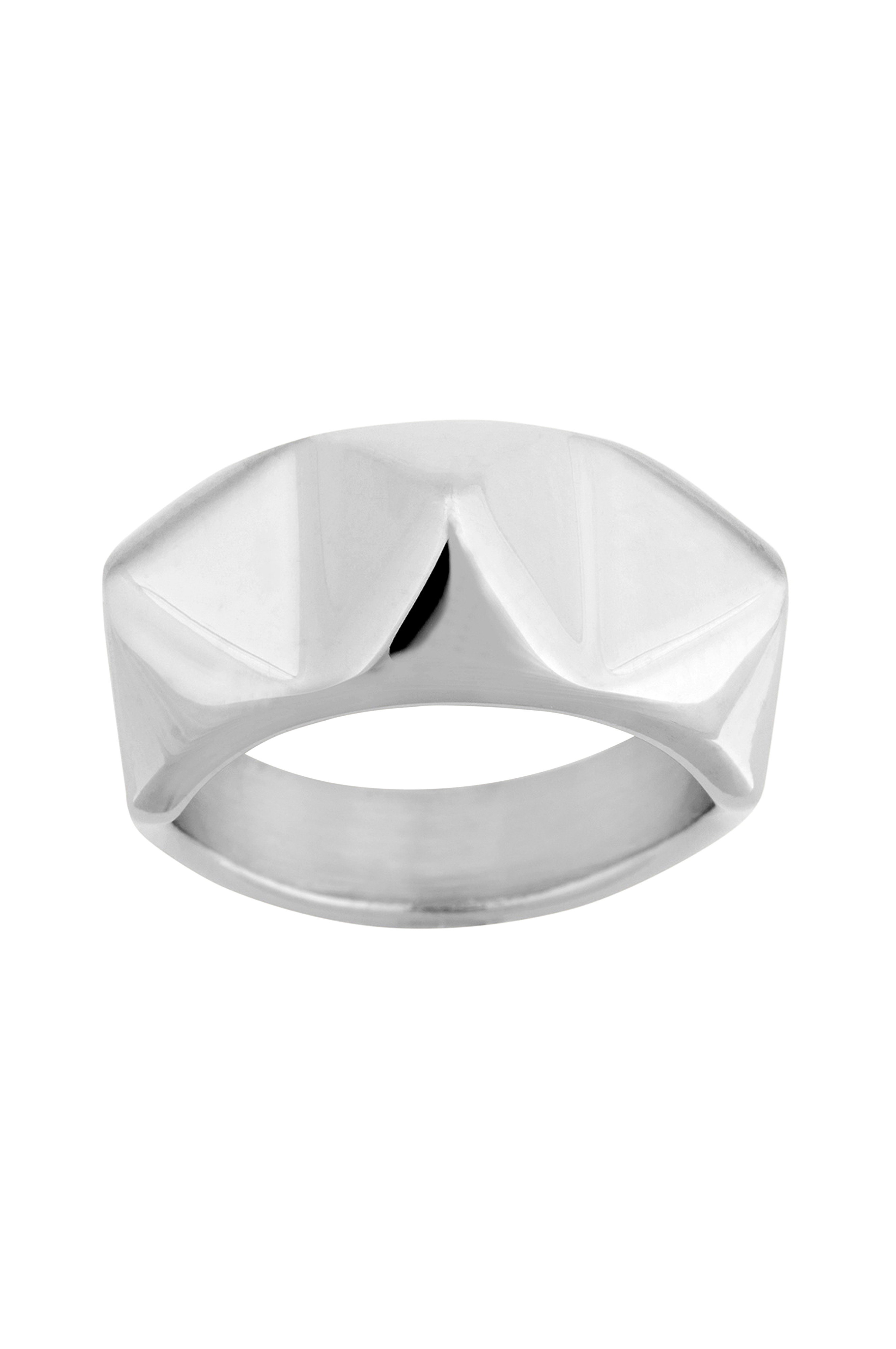 I serien Peak kommer här en lite bredare modell av ring med mer fyrkantiga mjuka nitar.Material: Blankt rostfritt stål.Mått: Höjd 6 mm, bredd 10 mm.Nickelsäkert.