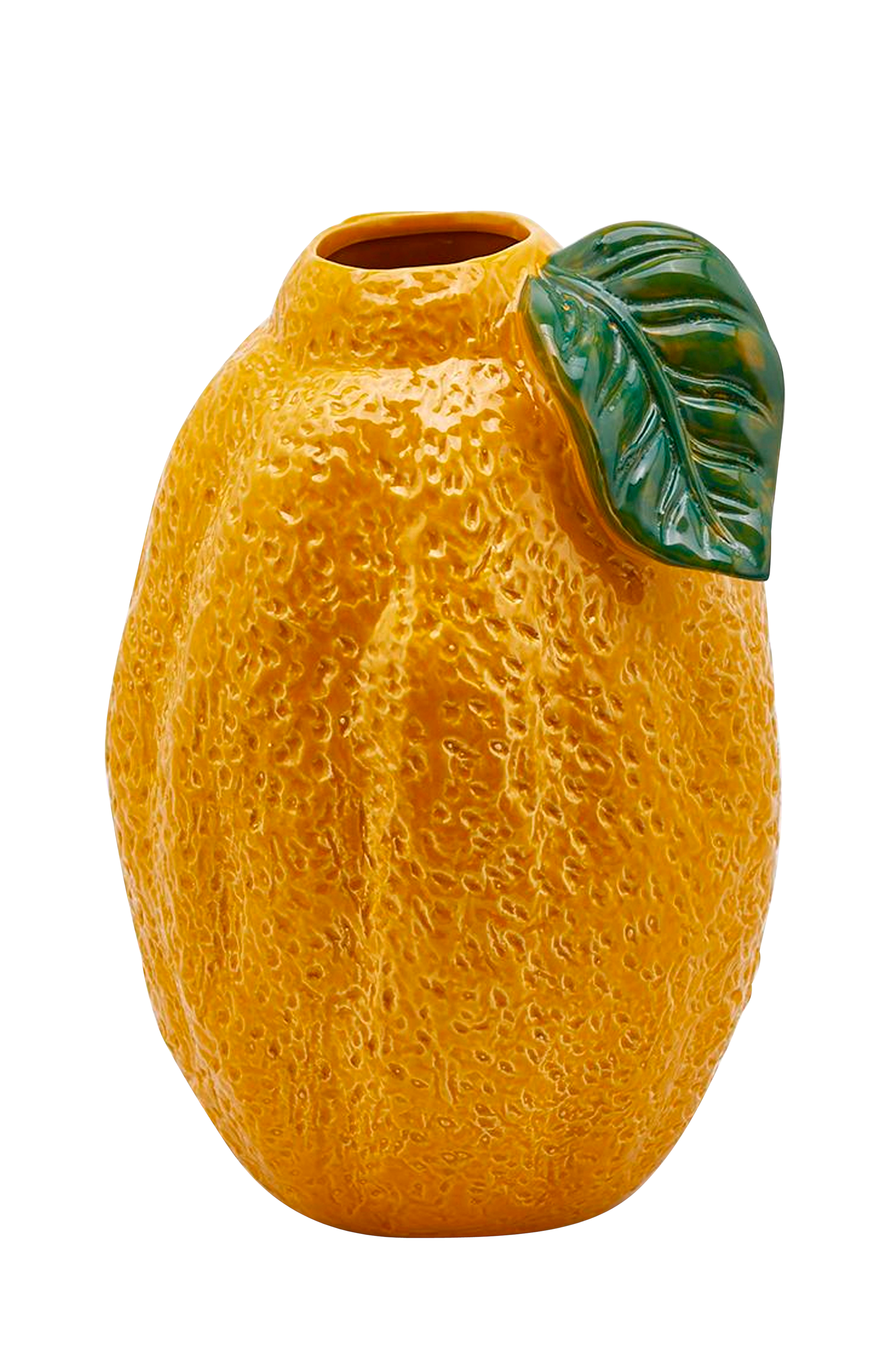 Citroner är en stor trend! Vad kan bli bättre än att ha en underbar vas med formen av en citron. Det gröna bladet på vasen gör den gula färgen ännu mer distinkt. Måtten på denna coola vas i keramik är 30x21 cm.