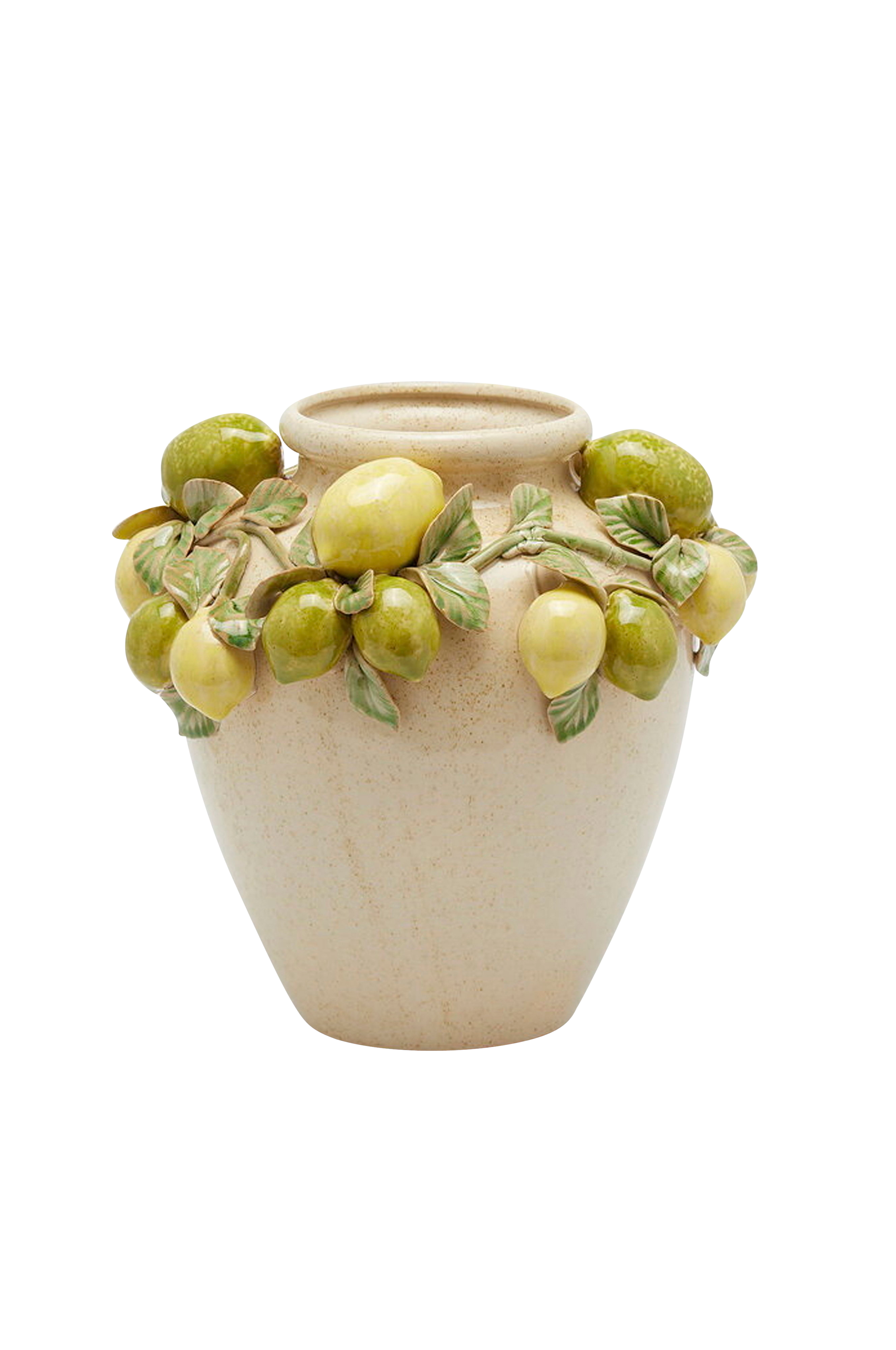 Den här handgjorda keramikvasen, dekorerad med ljusa citroner, visar upp ett intrikat hantverk och en fräsch, livfull design. Med en höjd på 26,5 cm och en diameter på 27 cm ger den en livlig och uppfriskande touch till alla utrymmen.