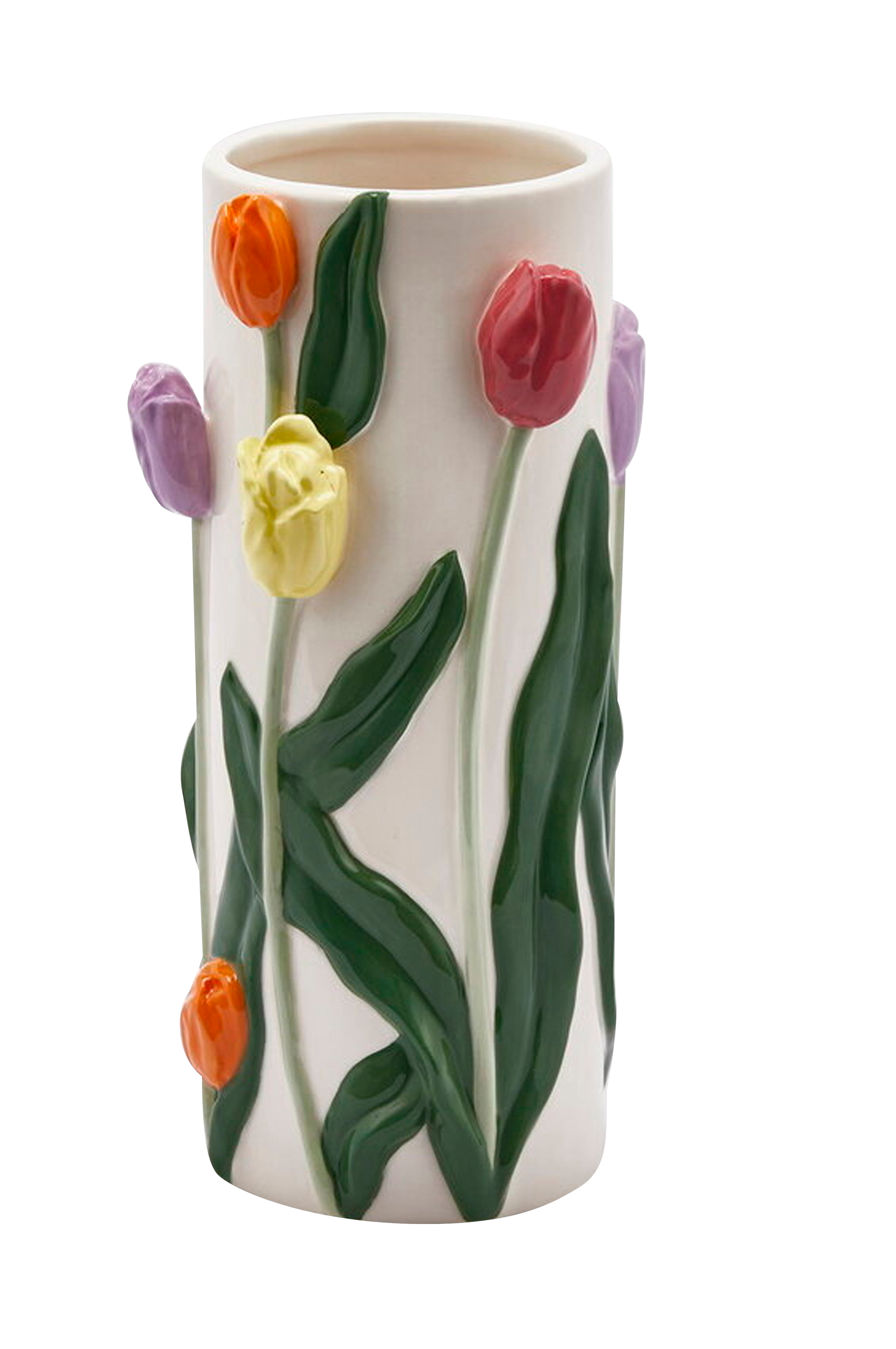 Den här handgjorda keramikvasen, prydd med vackra tulpaner, har ett detaljerat hantverk och en delikat design. Med en höjd på 28 cm och en diameter på 14,5 cm ger den en elegant och livfull touch till alla utrymmen.