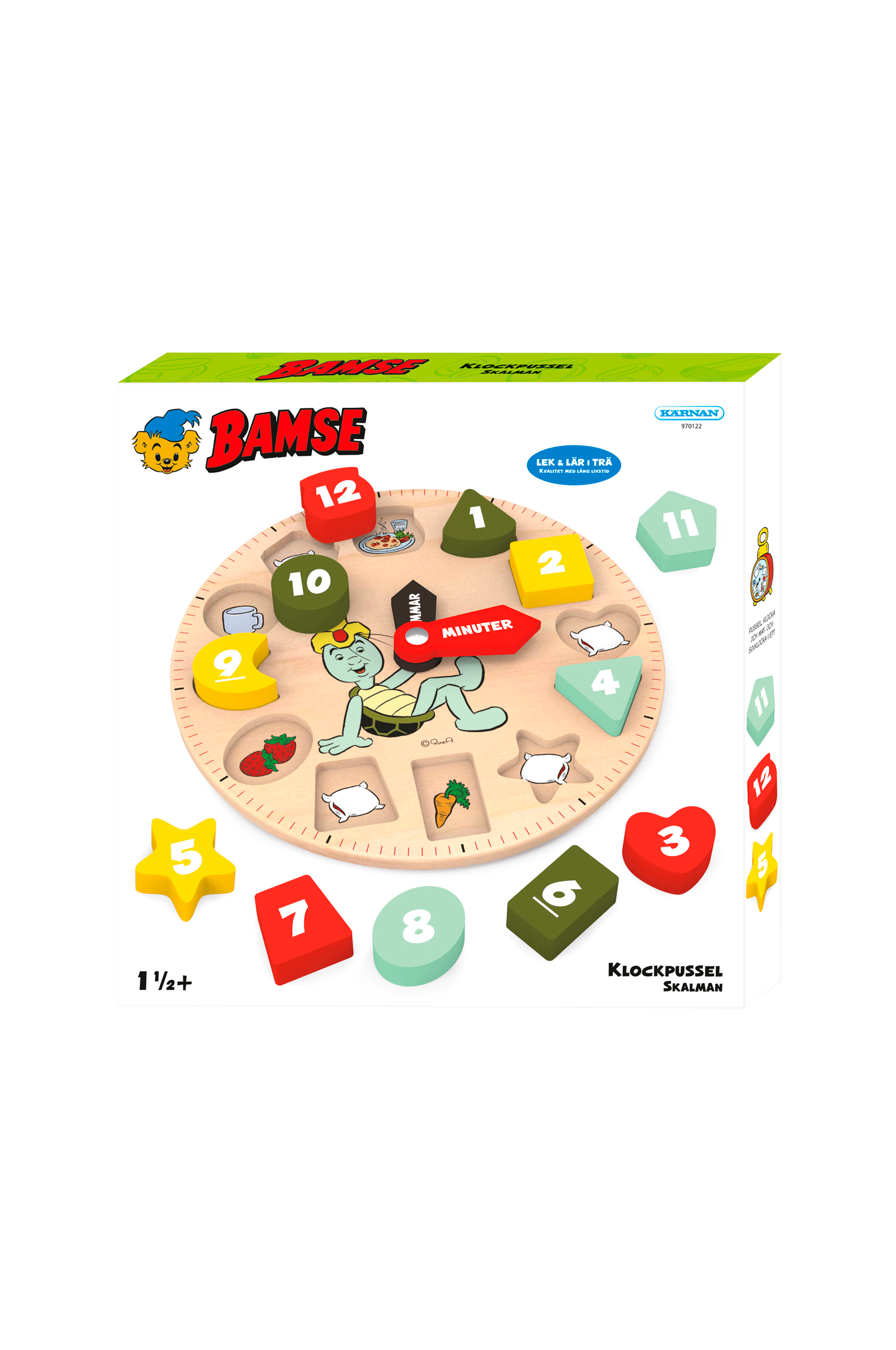 Skalmans mat-och- sovklocka gör att man kan både lära sig klockan med dess rörliga visare och använda det som ett pussel. Lek och lär i trä, kvalitet med lång livstid. FSC-märk.
