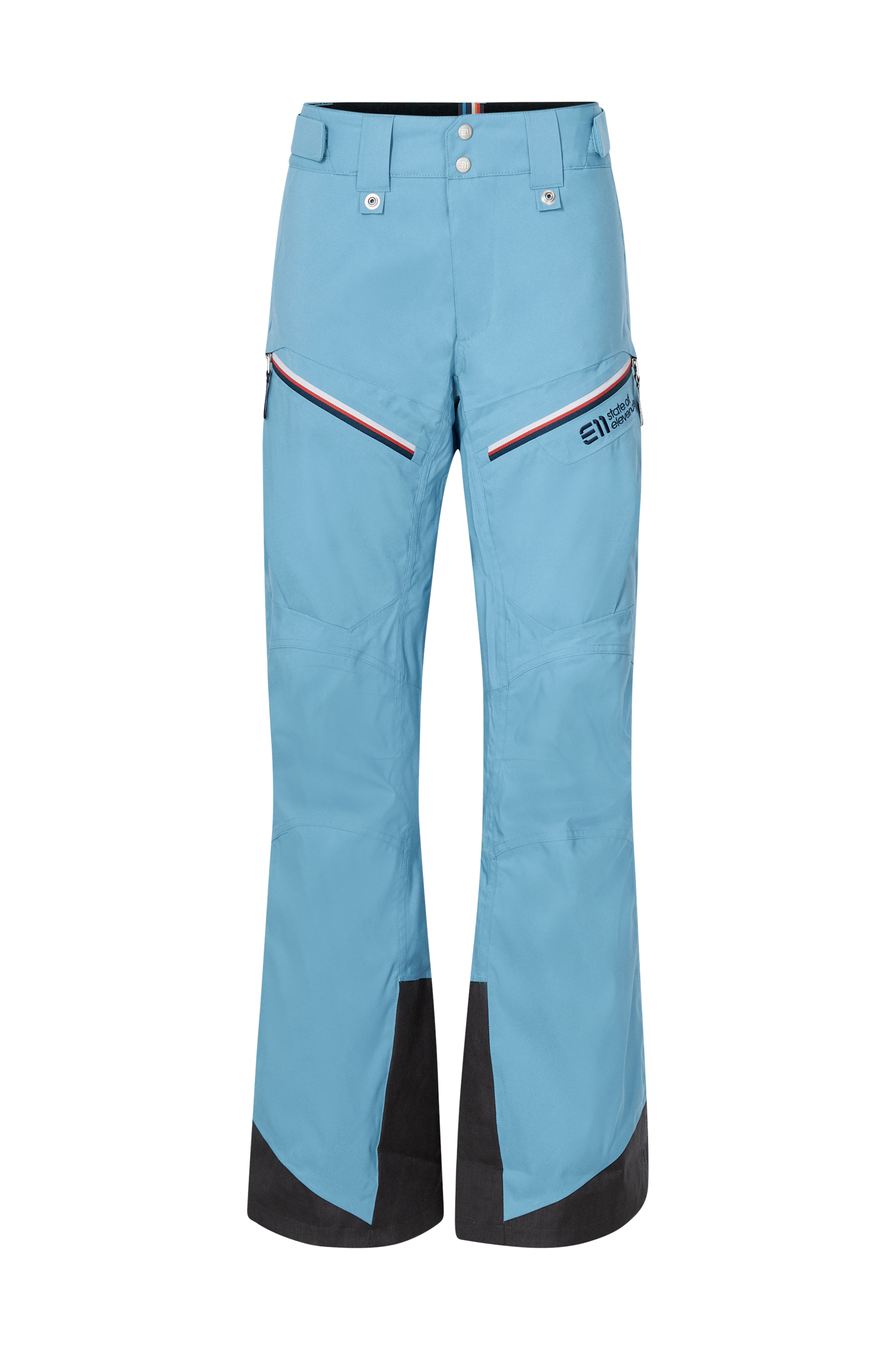 Vattentäta skidbyxor med god andningsförmåga och flexibel, ledig passform för långa dagar i backen. Gjorda i återvunnet material med tvålagerskonstruktion och lätt isolering. Förstärkning i bensluten. Dragkedjor i sidorna för extra ventilation vid behov. Två stora dragkedjefickor fram och två bakfickor med lock och knapp. Justerbar midja med kardborre i sidorna. Tryckknappar fram och dragkedjegylf. Snölås i bensluten. Vattenpelare 10 000 mm och andningsförmåga 10 000 g/m2/24h.