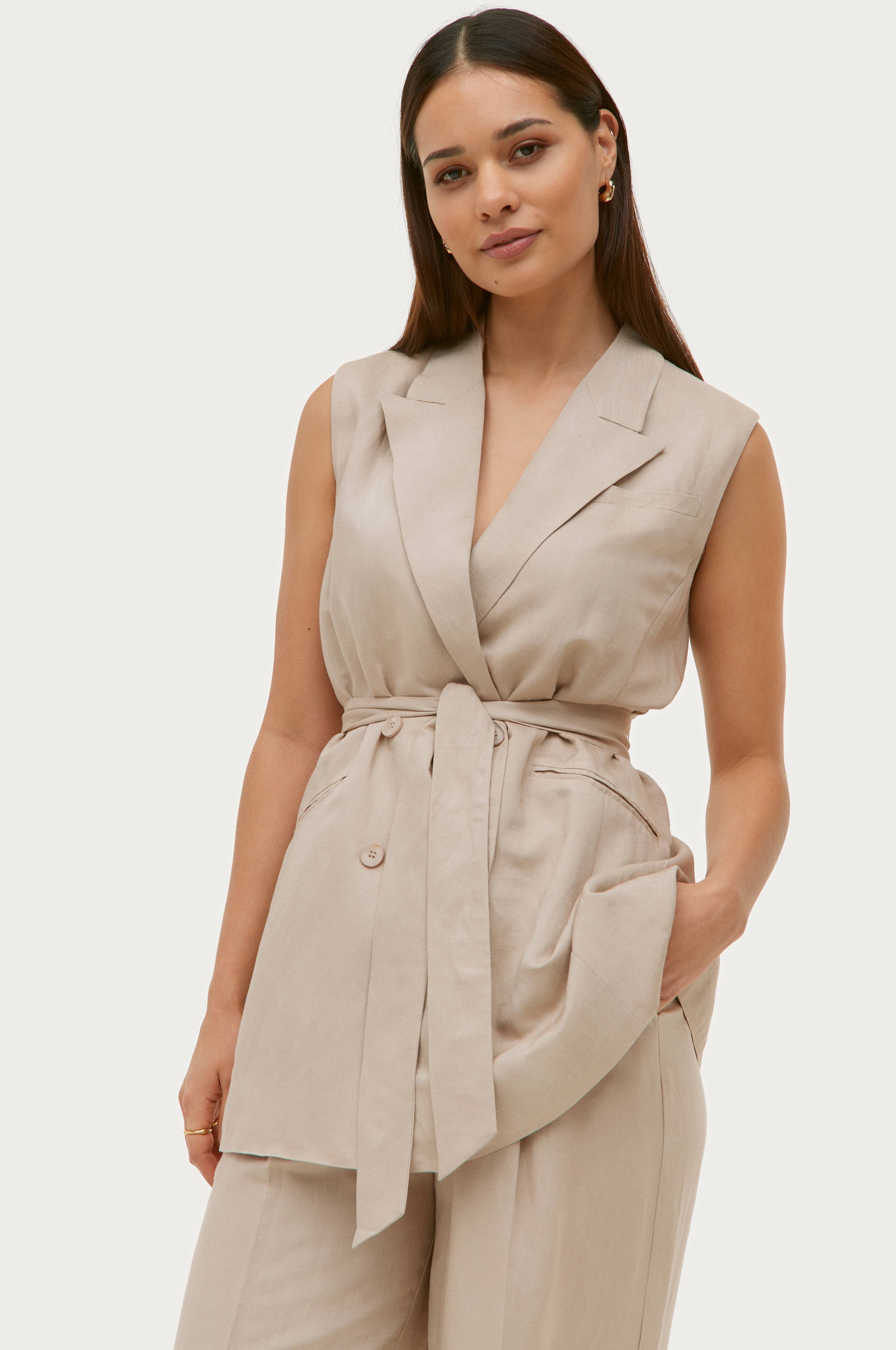 Ärmlös kavaj i linnemix. Rak modell med två knappar och två dekorknappar. Avtagbart knytskärp i midjan. Två passpoalfickor nedtill och en fuskficka upptill. Sprund nedtill bak. Längd ca 81 cm i stl 36.