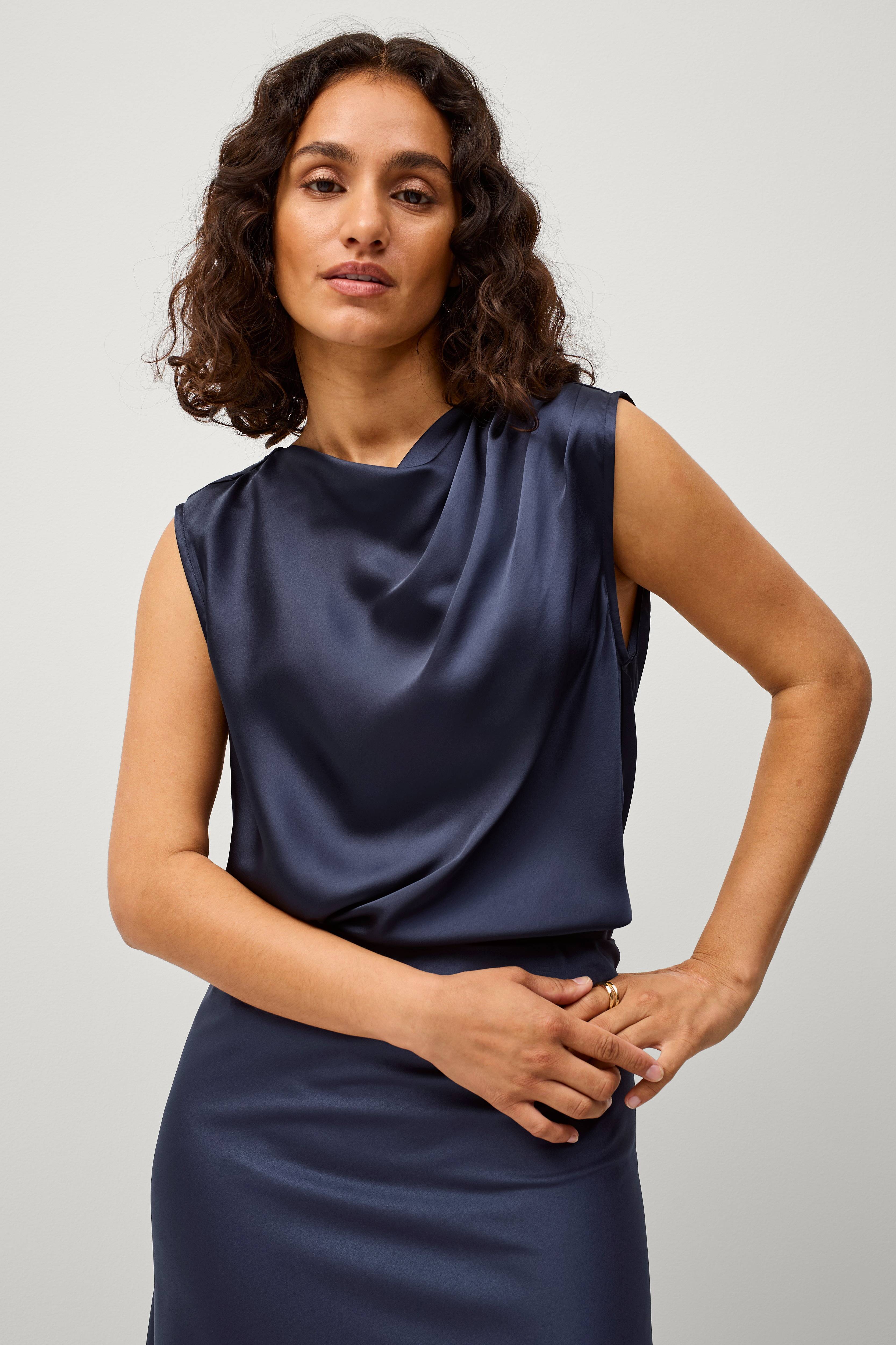 • Draperad hals med tygveck på ena axeln