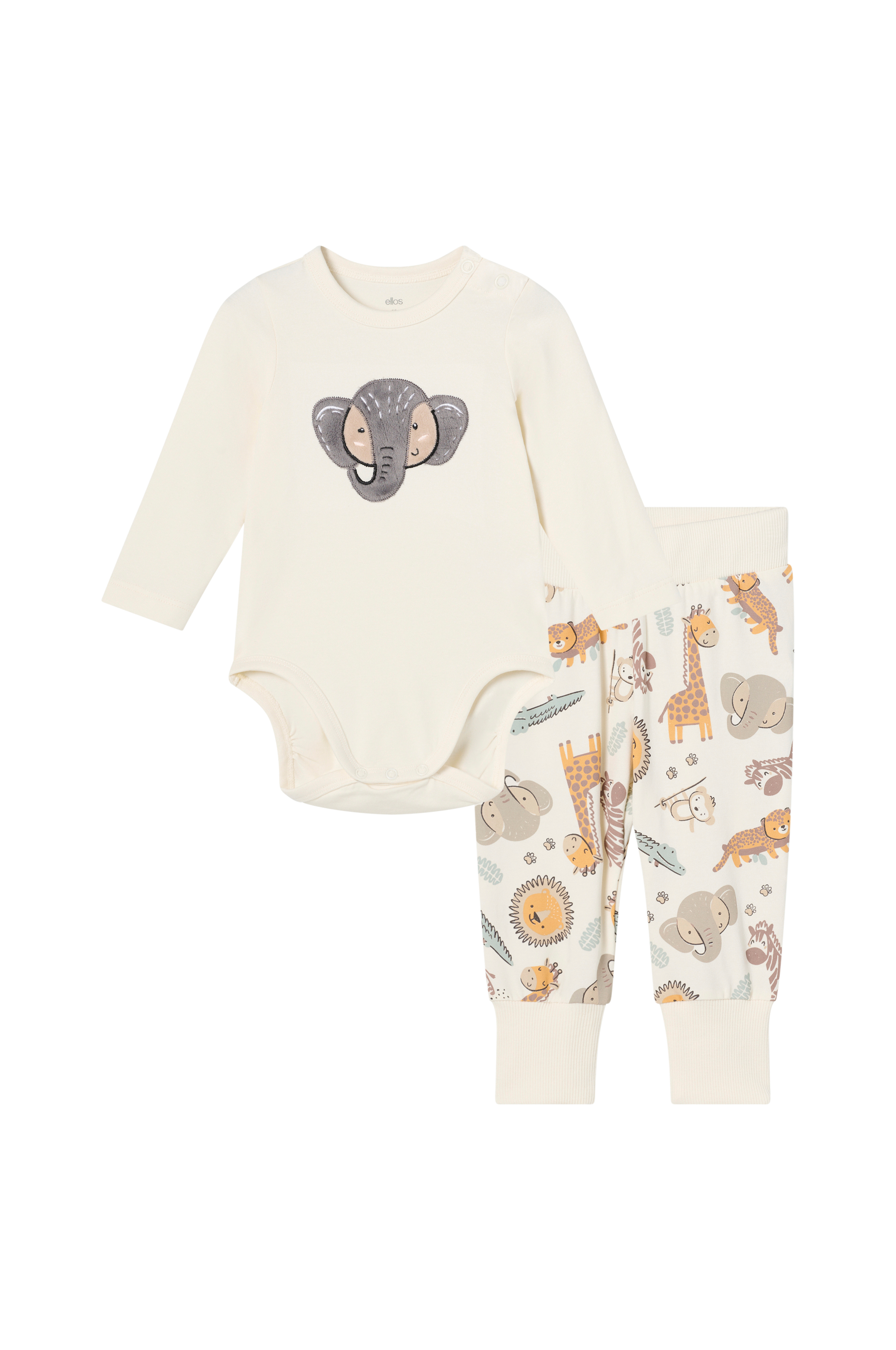 • 2-delat set i mjuk bomullstrikå• Långärmad body med rund halsringning och mjuk, fluffig figur fram• Tryckknappar på ena axeln och i grenen• Mönstrade byxor med ribbad midja och ribbmuddar i bensluten