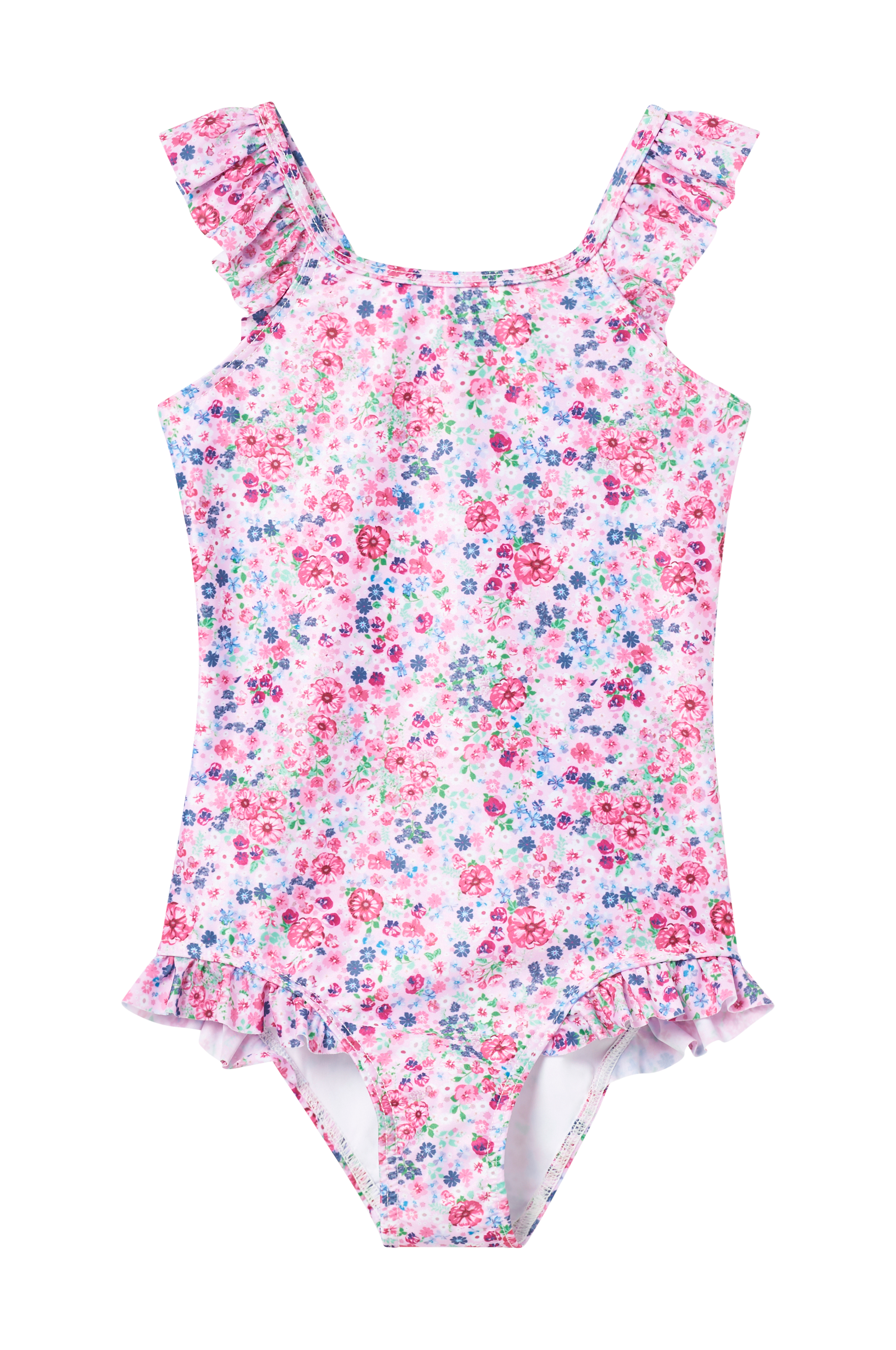 Baddräkt Elouise med volanger på axlarna och längs benöppningarna. Rak ryggskärning och v-formade axelband med volanger. Helfodrad.