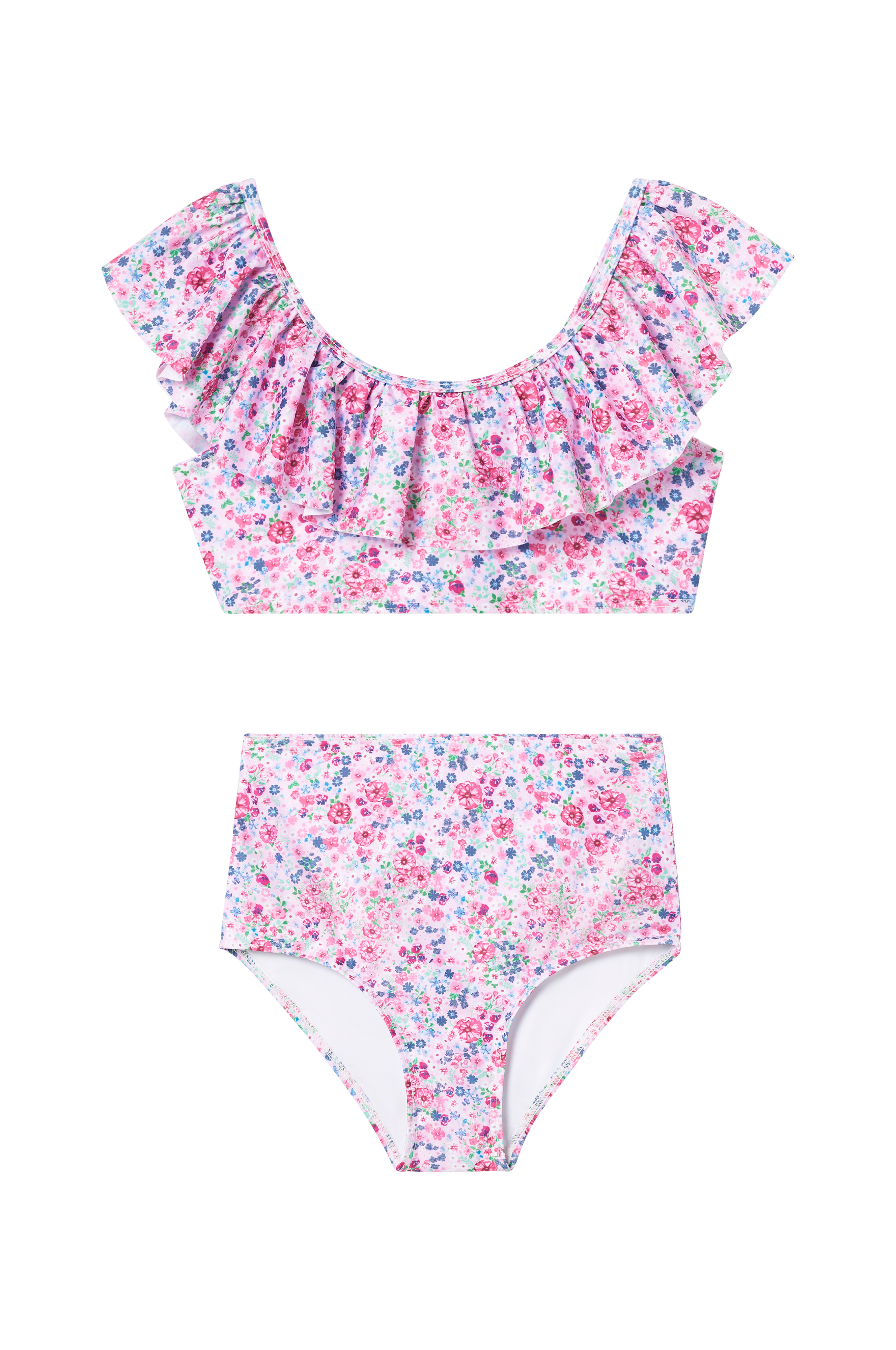 Bikini Noemi i två delar. Bikinitopp med bred volang upptill runtom och smal resår nedtill. Bikinitrosa i hög hipstermodell med breda sidor. Helfodrad.