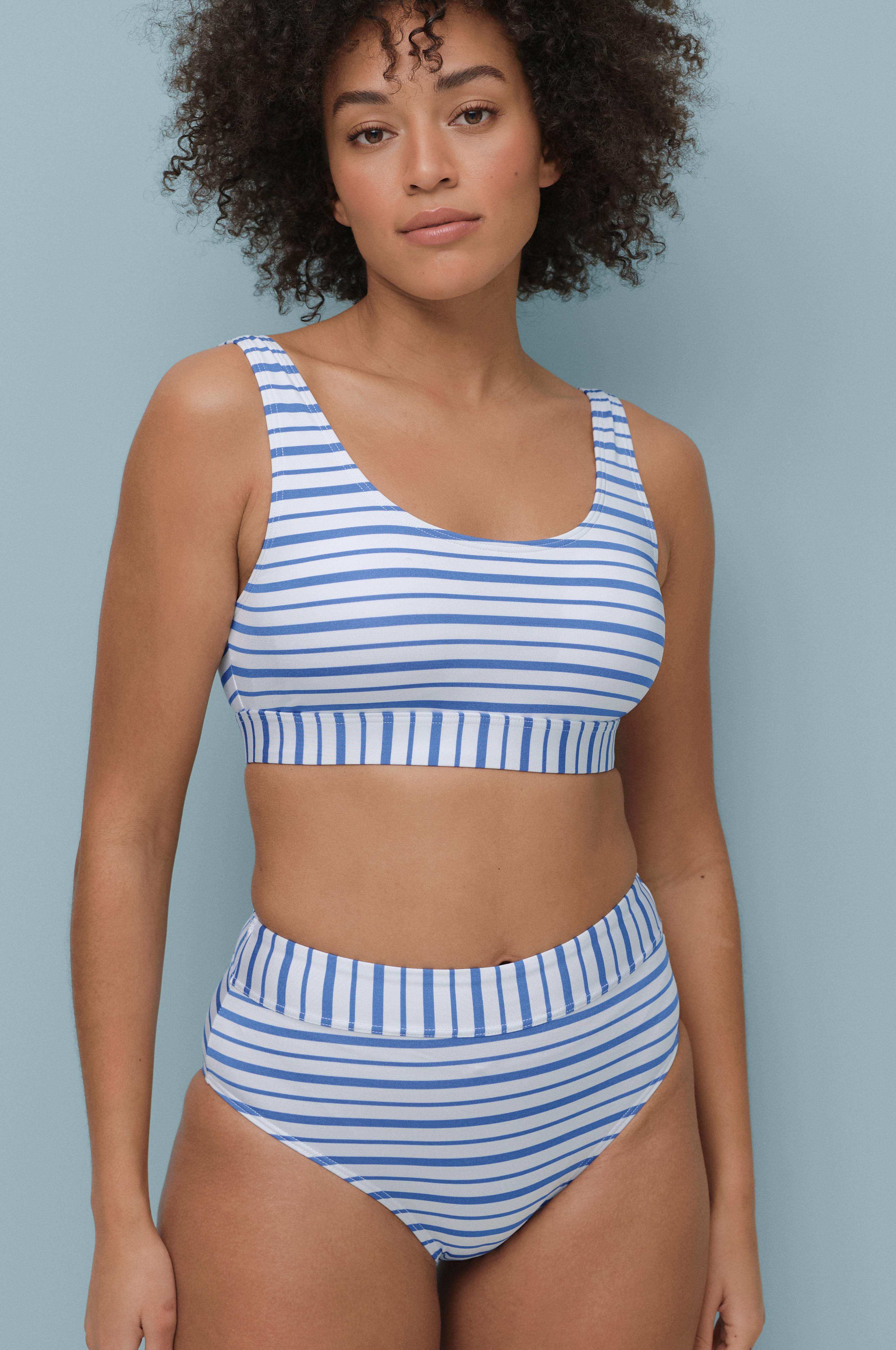 Underbar bikini trosa med hög midja och bred Kant. Sitter jätteskönt runtom och materialet är följsamt. Dessutom här i en så snygg färgkombination med randigt mönster. En riktig kl…