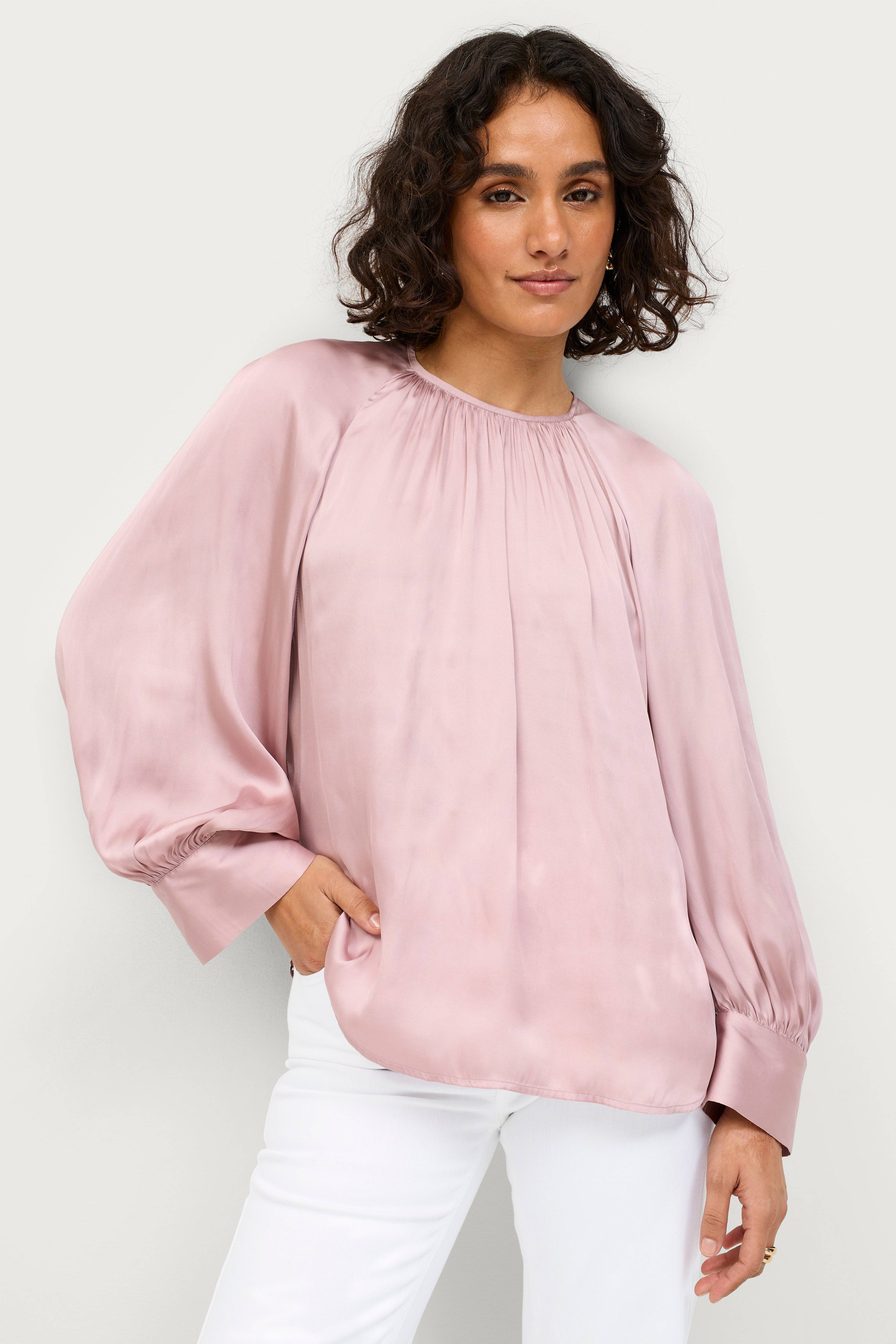 • Ballongärmar med manschett i ärmsluten • Rynkad halsringning • Sprund med knapp i nacken • Kvalitet med lyster • Längd: 60 cm i storlek 34/36 • Produkten innehåller återvunnet material som har tagits tillvara för att minska mängden avfall, samtidigt som nya resurser inte har förbrukats.