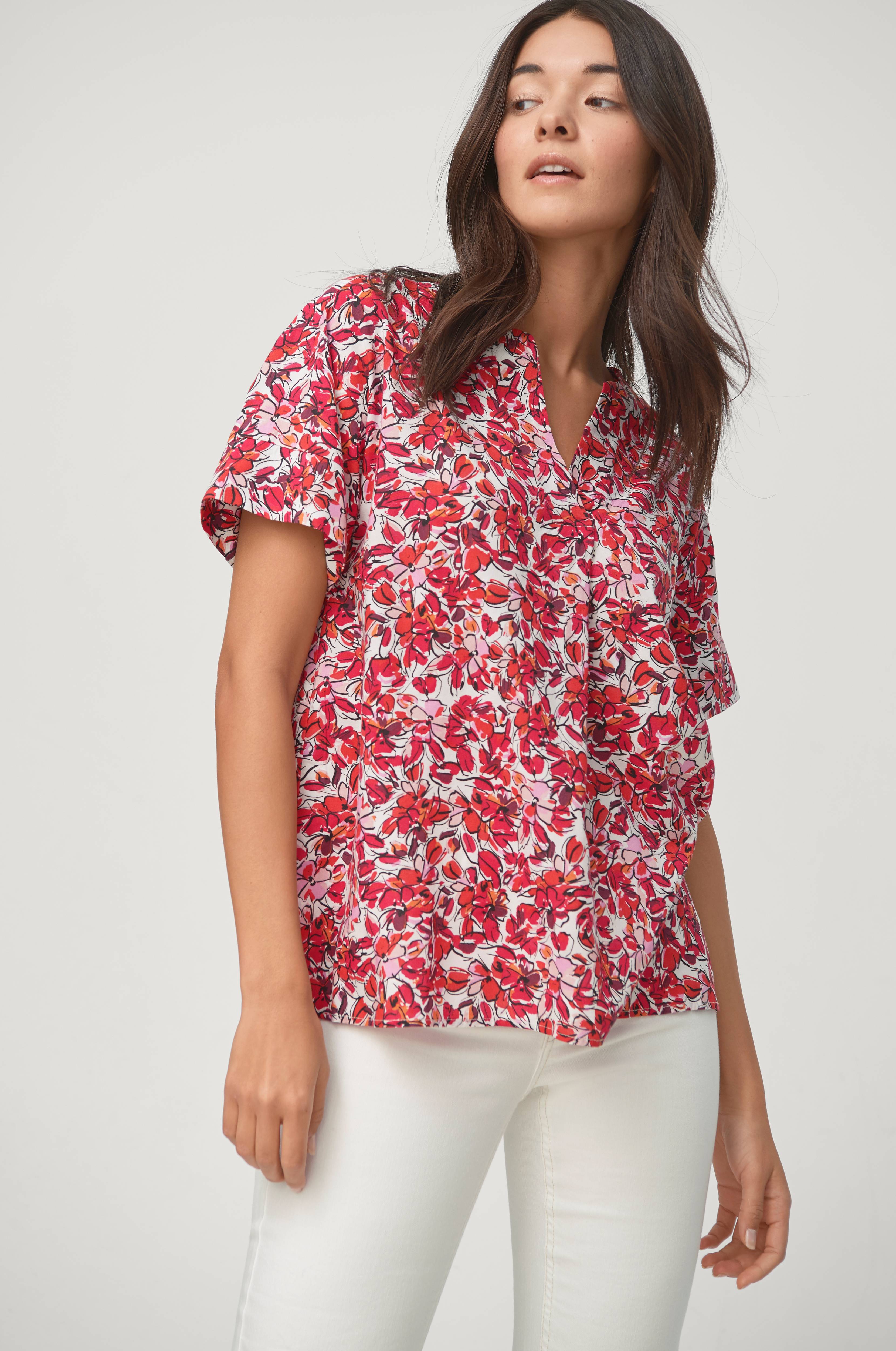 Blus Gry i rak oversizemodell med rund hals och sprund fram samt stort, lagt veck på bröstet. Kort, rak ärm med påsydd kant i ärmslut och avskuret axelok med lagt veck bak. Längd bak ca 74 cm i stl 36.