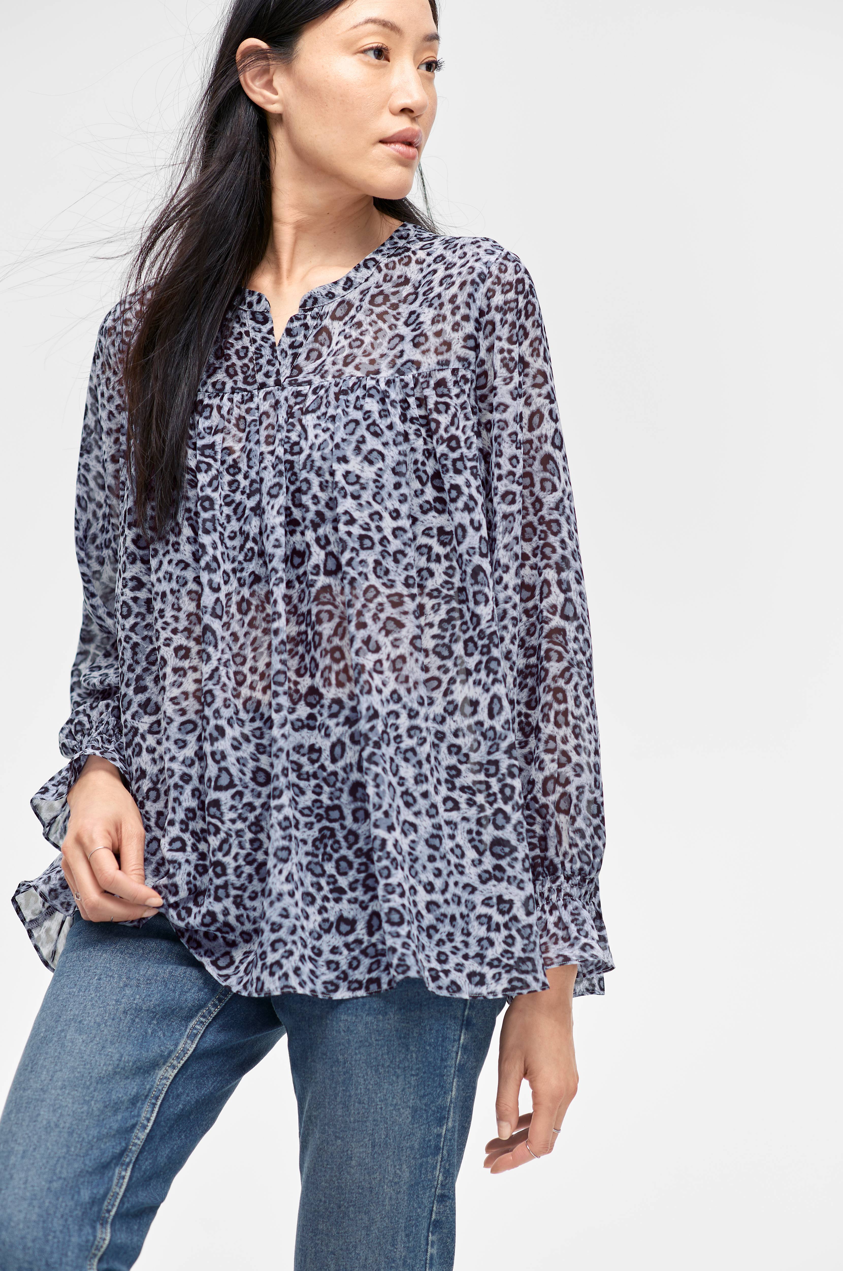 Blus Isa Leo i transparent, vävd kvalitet med avskärning upptill med rynk både fram och bak. Långa ärmar med smockresår och volangavslut. Sprund i halsringningen fram. Längd 69 cm i stl 36.