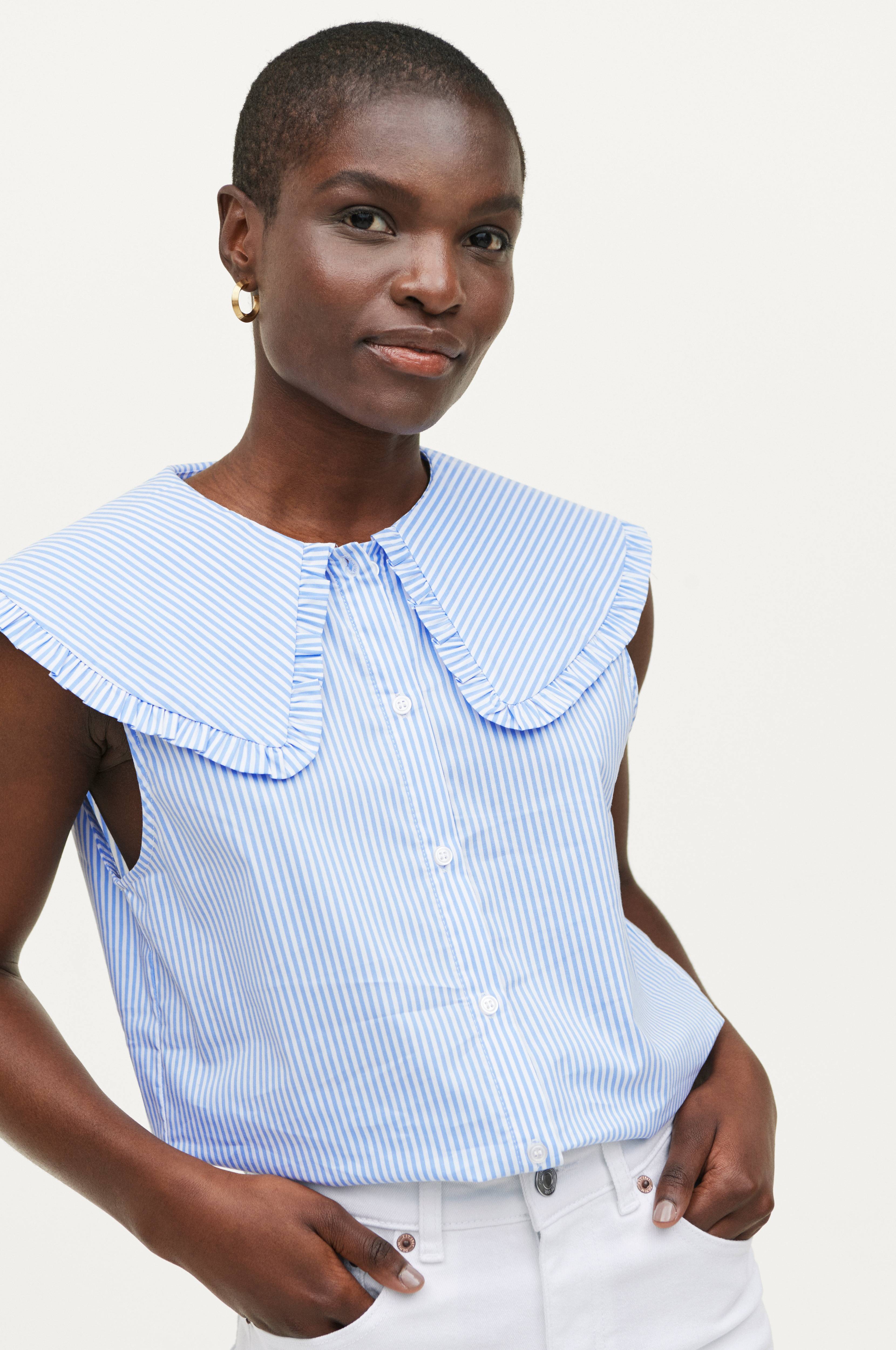 Ärmlös blus med stor volangkrage och knappar fram. Längd ca 63 cm i stl 36.