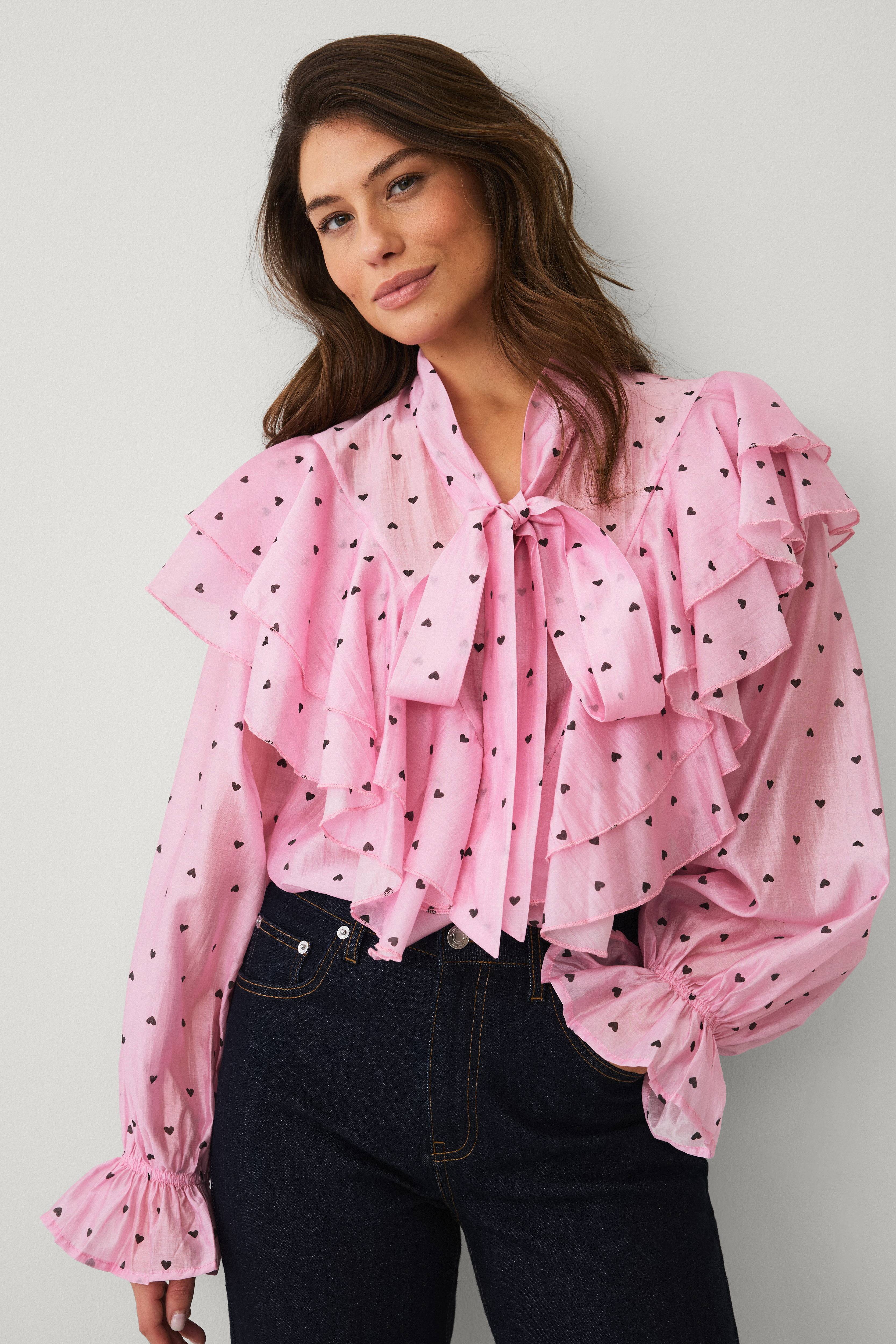• Långärmad, halvtransparent blus i chiffong• V-ringad hals med knytband fram• Dekorativa volanger runt hela• Ballongärmar med resår och volang i ärmsluten• Längd: 66 cm i storlek S