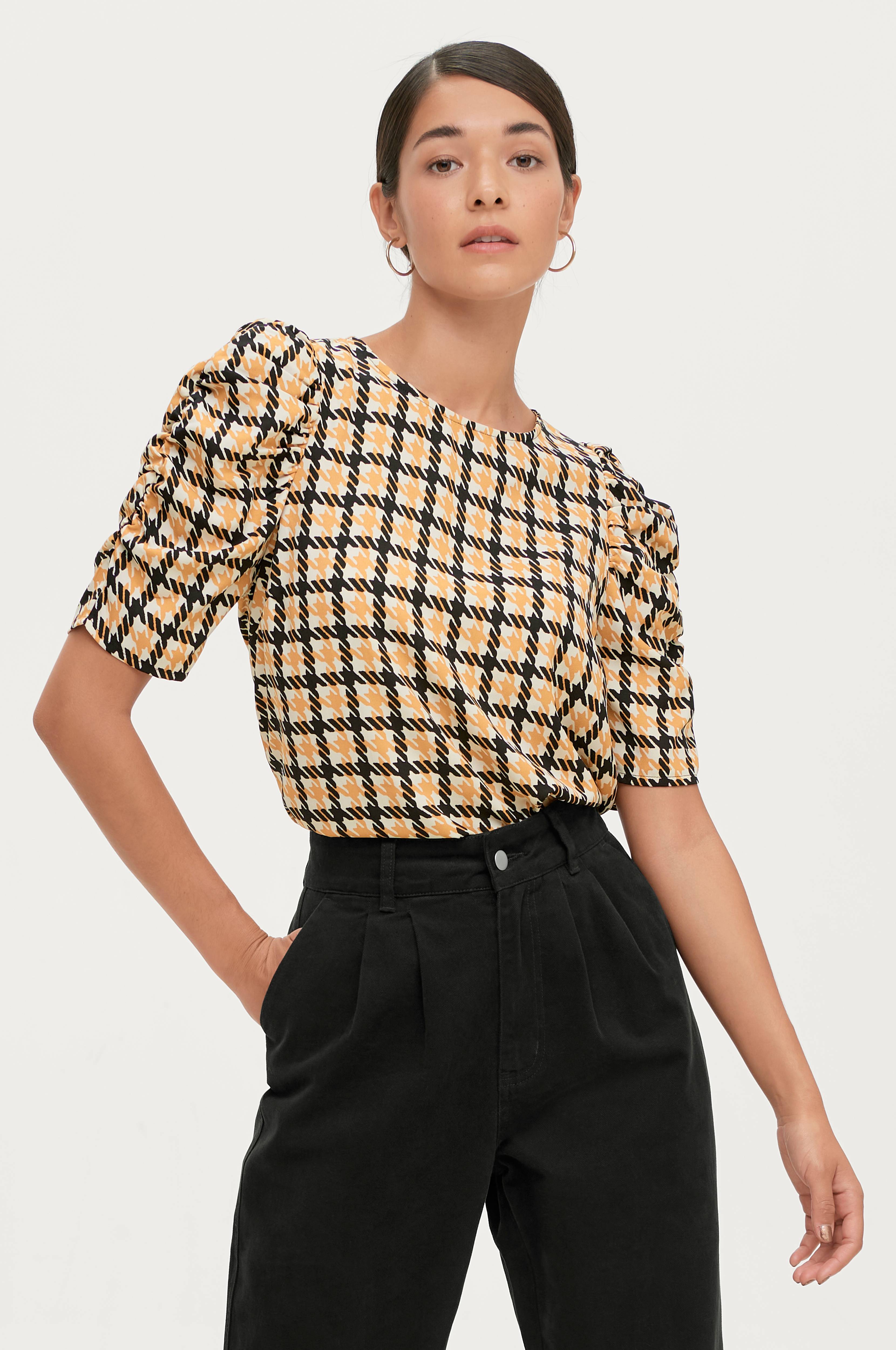 Blus Mika i rak modell med kort puffärm som har rynk vid axeln och längs ovansidan. Rund hals med smal fåll och sprund med knapp i nacken. Vävd crepekvalitet. Längd ca 61 cm i stl 36.