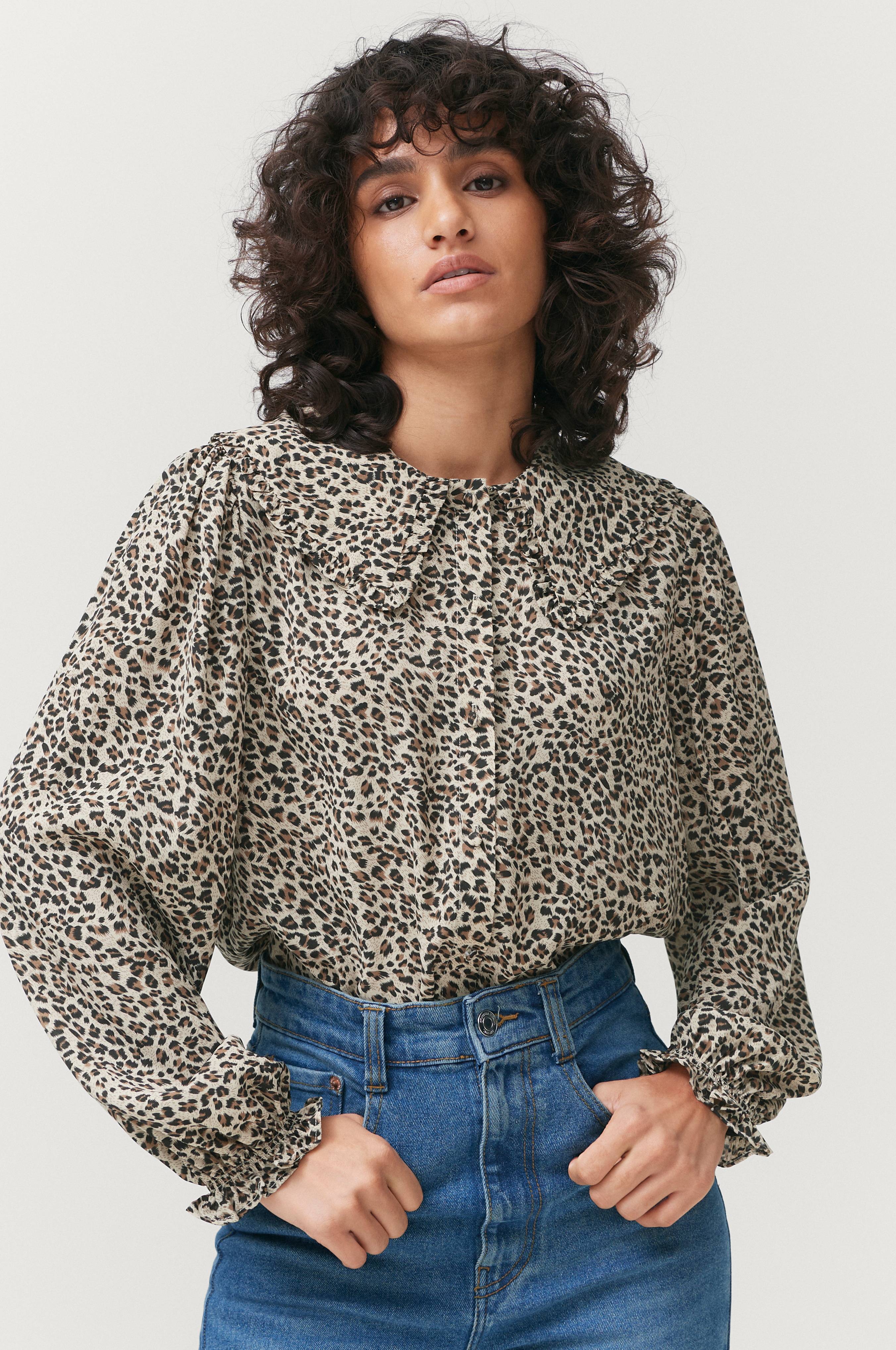 Blus Olivia med klädda knappar fram, bred volangkrage och något vidare ärmar med rynkad axelsöm och elastiska ärmslut med liten volang. Gjord i vävd, mönstrad kvalitet. Längd ca 62 cm i stl 36.