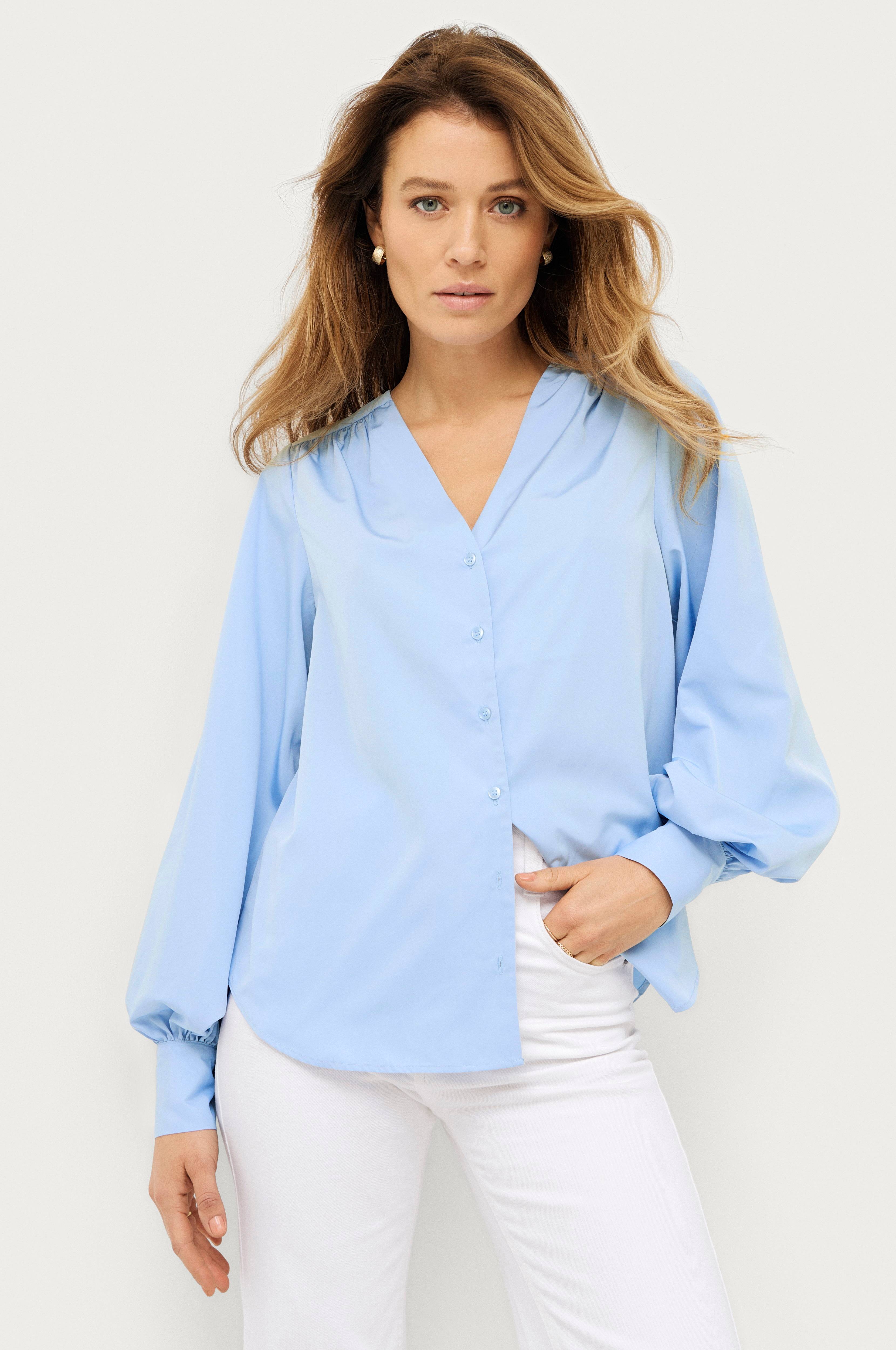 • V-ringad hals• Knappar fram• Rynkade detaljer på axlarna och på ryggen• Ballongärmar med rynk i ärmsluten• Manschett med två knappar• Längd: 66 cm i storlek 34/36