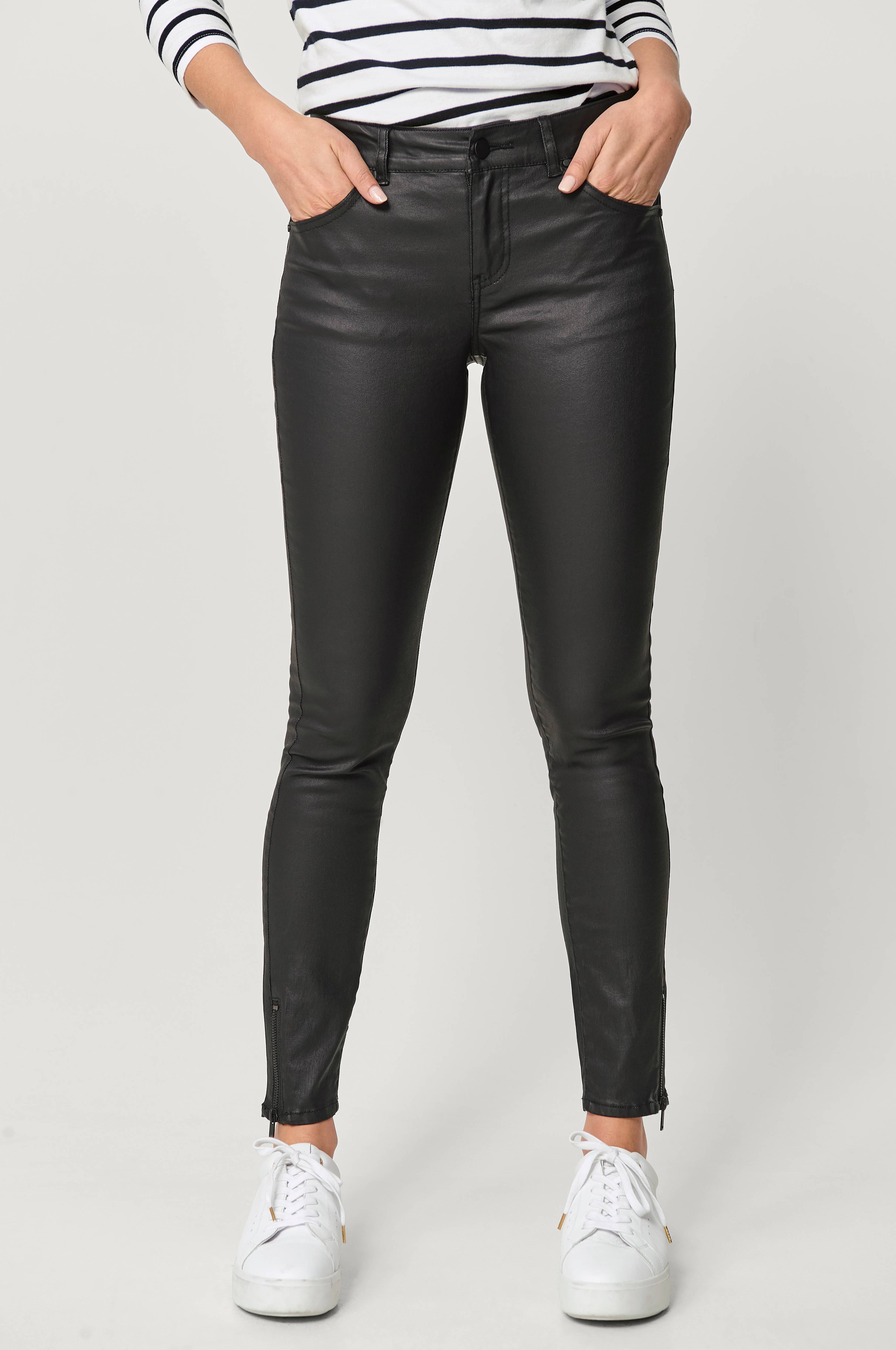 Byxa Thea Coated Zip i smal, stretchig modell med svarta, funktionella dragkedjor på utsida ben nedtill. Byxan har en s.k. coatad yta som ger en lätt glansig fuskläderlook. Klassisk femficksmodell med dragkedja och knapp i gylfen. Beninnerlängd 75 cm i stl 38.
